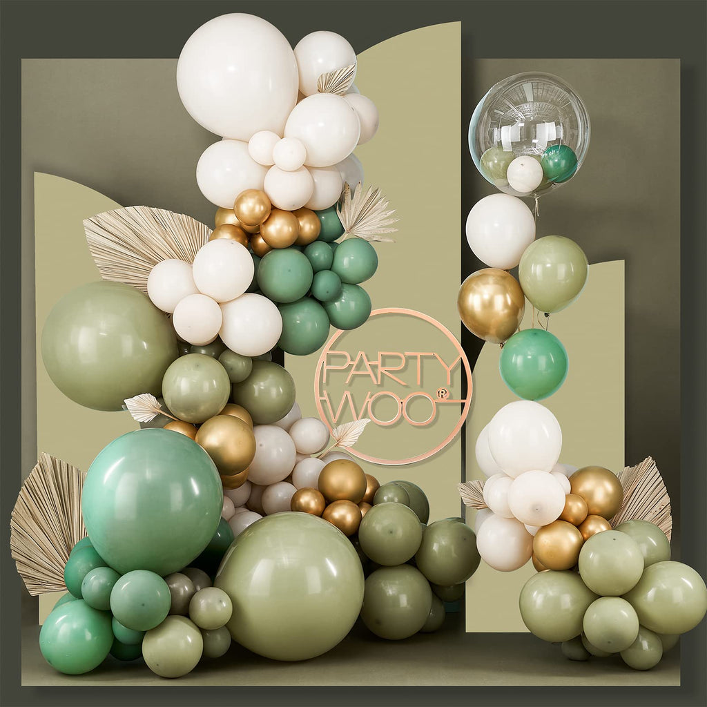 PartyWoo 140 pcs Olive Green Balloon Arch Kit, Sage Green Balloon Garland Kit with Cream White Metallic Gold Retro Green Clear Balloons and Arch Kit for Birthday, Baby Shower, Wedding