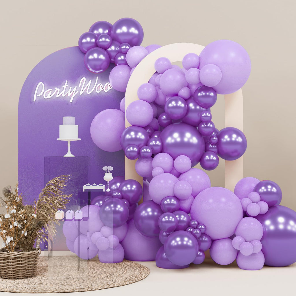 PartyWoo Purple Balloons, 142 pcs Lilac and Metallic Purple Balloons Different Sizes Pack of 18 Inch 12 Inch 10 Inch 5 Inch for Balloon Garland Balloon Arch as Birthday Decorations, Party Decorations