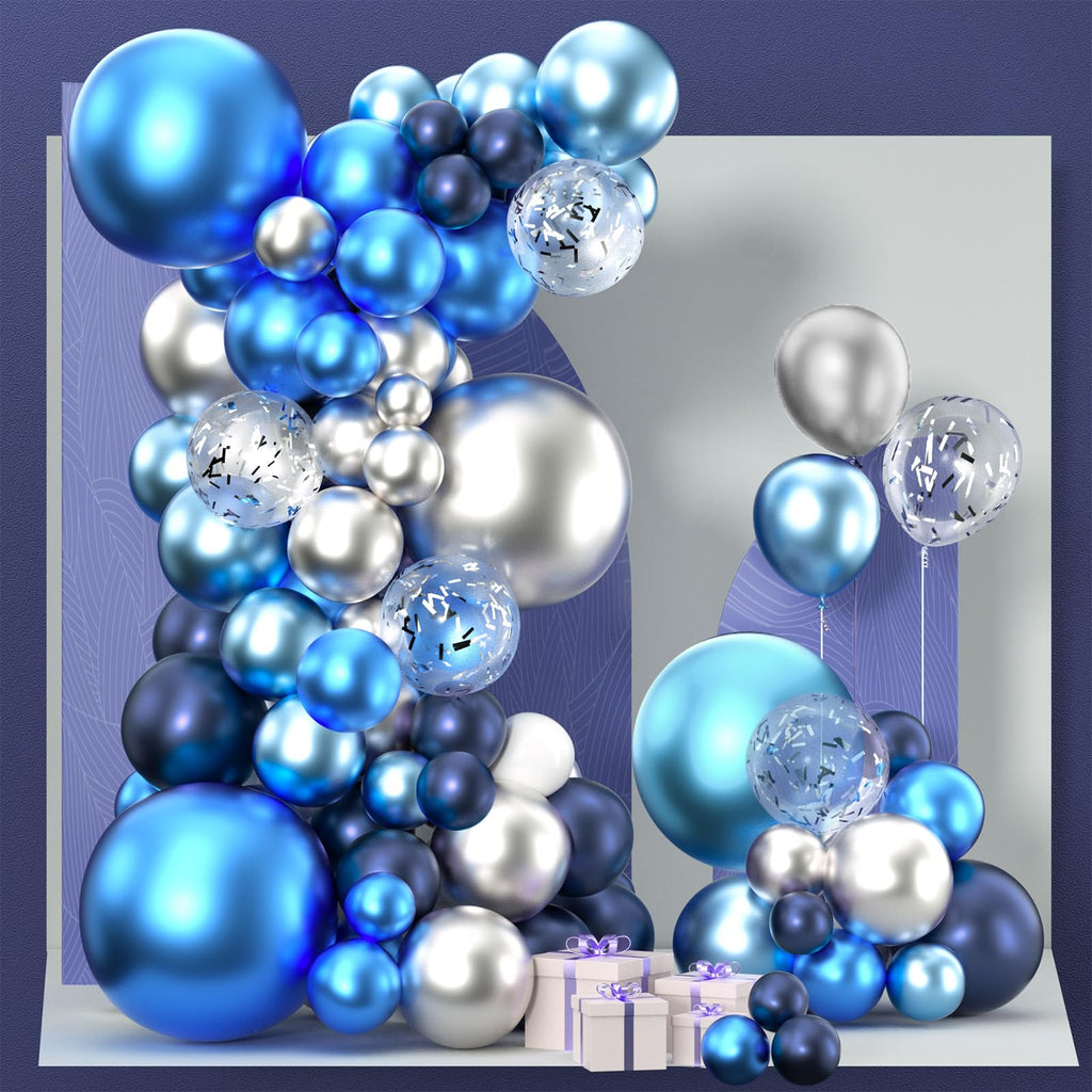PartyWoo Blue Balloon Garland Kit, 140 pcs Blue and White Balloon Arch Kit, 4D Silver Balloons, Metallic Balloons, Confetti Balloons for Baby Shower Decorations, Birthday Decorations, Baptism