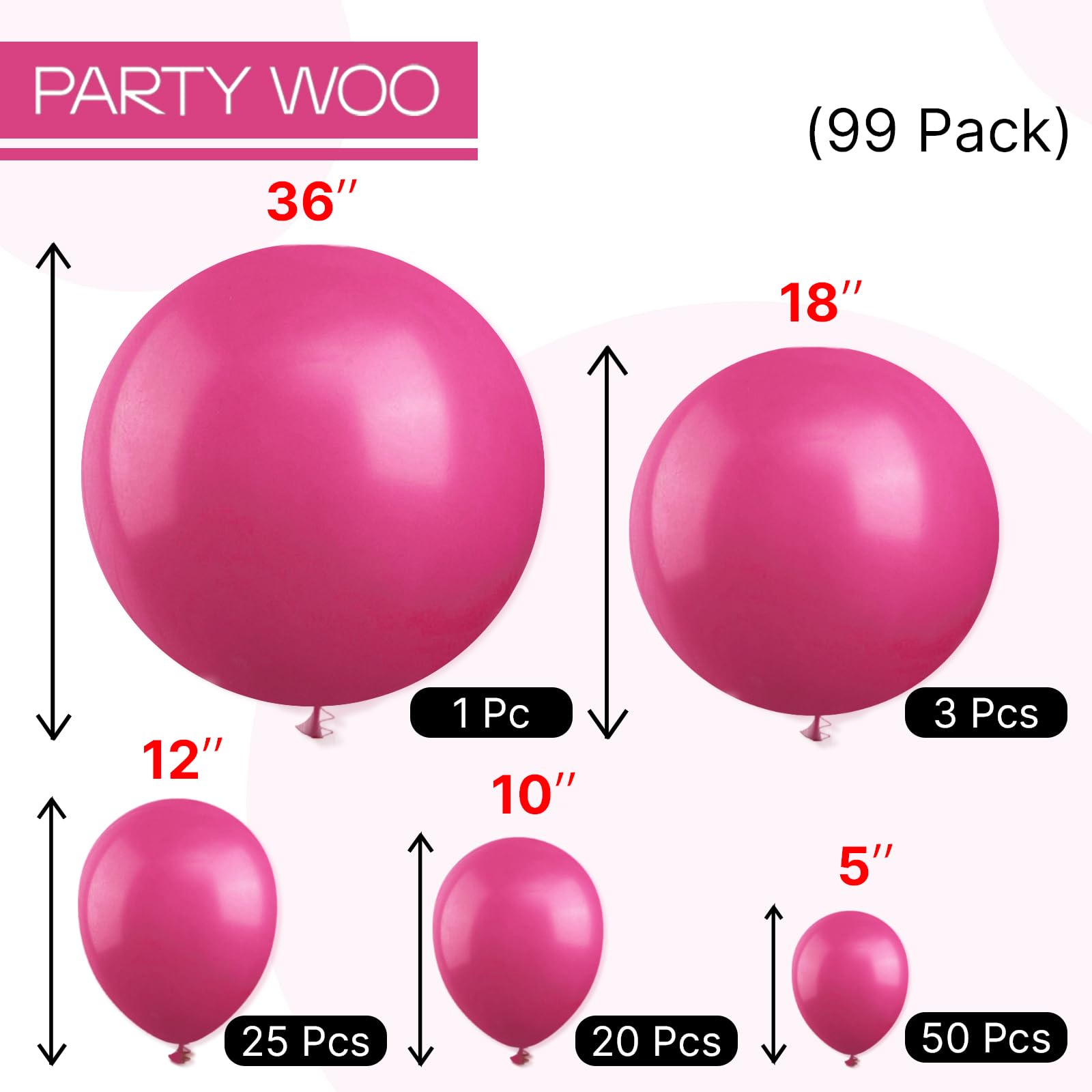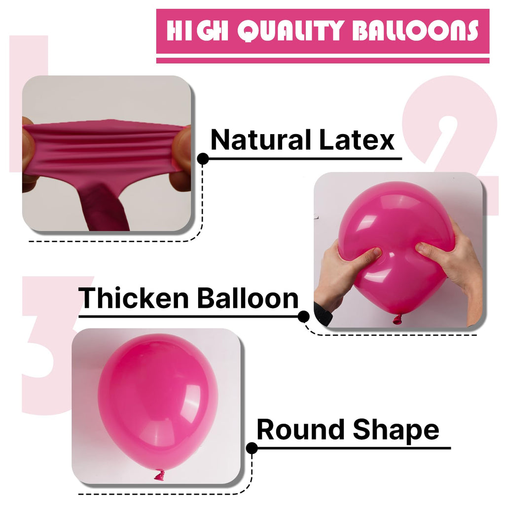 - 99 PCS HOT PINK BALLOONS IN DIFFERENT SIZES: Includes 36 inch (1 pcs) 18 inch (3 pcs), 12 inch (25 pcs), 10 inch (20 pcs), and 5 inch (50 pcs). These large and small balloons are perfect for creating stunning balloon garlands and arch kits