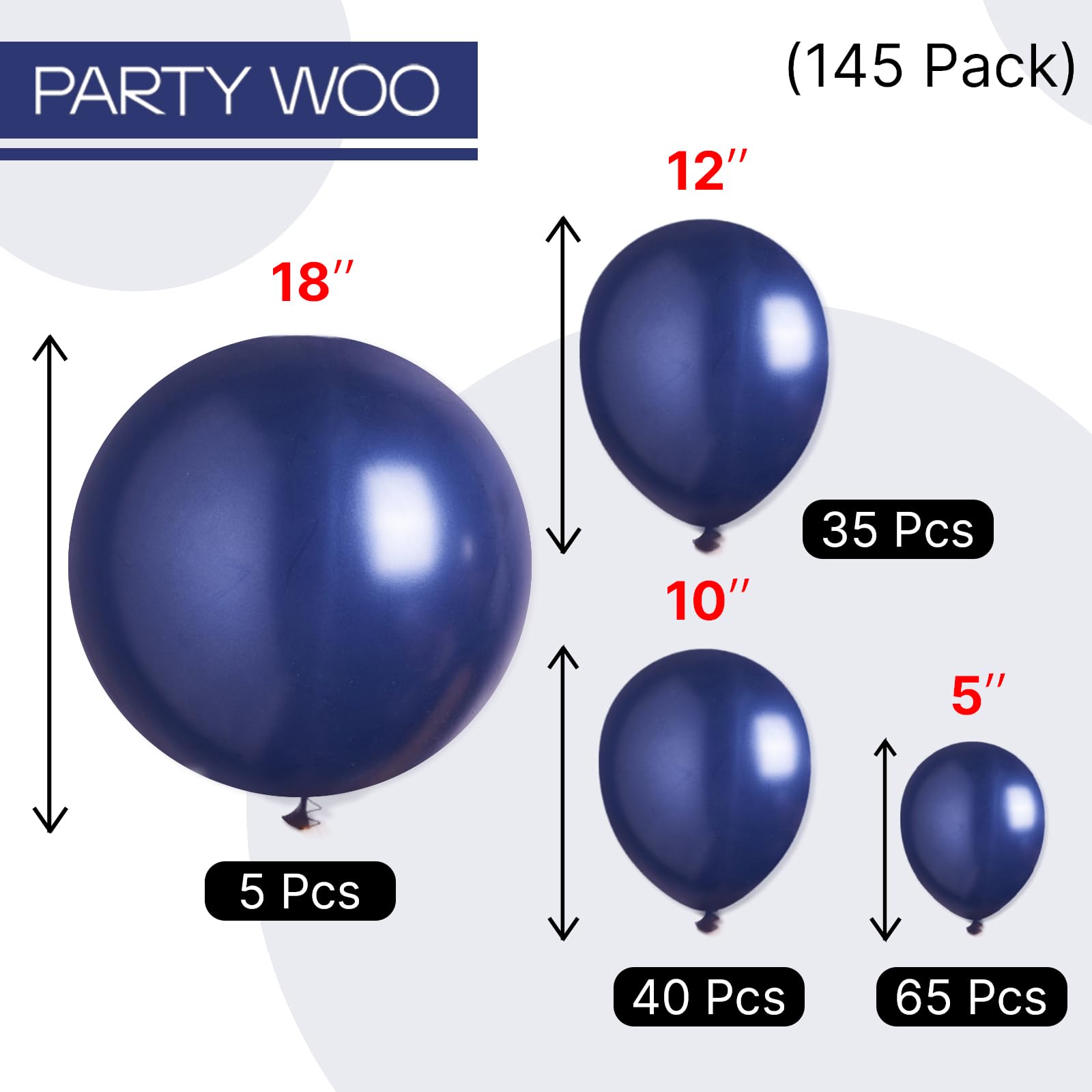 - 145 PCS NAVY BLUE BALLOONS IN DIFFERENT SIZES: Includes 18 inch (5 pcs), 12 inch (35 pcs), 10 inch (40 pcs), and 5 inch (65 pcs). These large and small balloons are perfect for creating stunning balloon garlands and arch kits