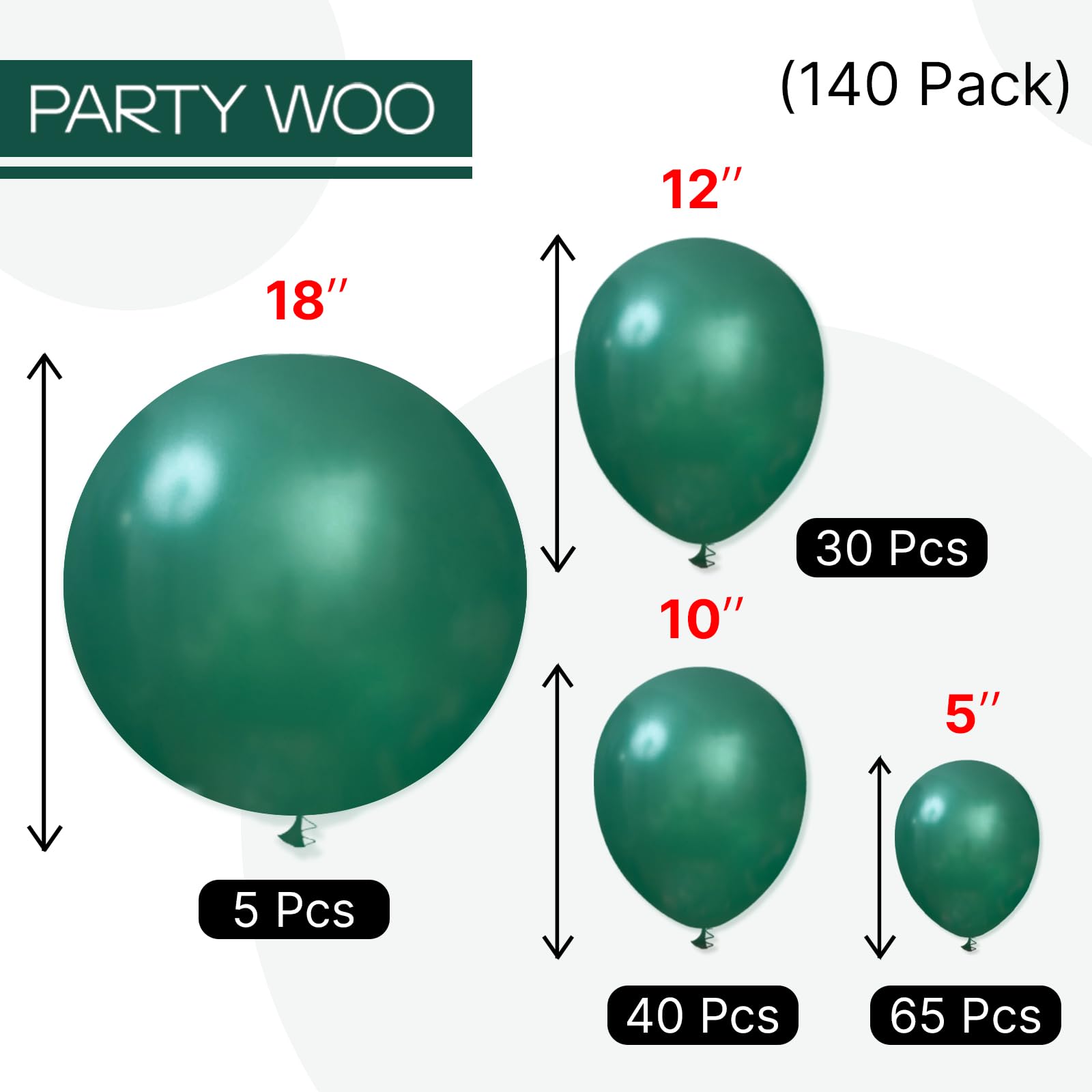 - Package includes: Total 140 pcs pearl dark green balloons, including, 18 inch (5 pcs), 12 inch (30 pcs), 10 inch (40 pcs), 5 inch (65 pcs), suitable for parties, pay attentions that the 5 inch balloons could NOT float when inflated with HELIUM.