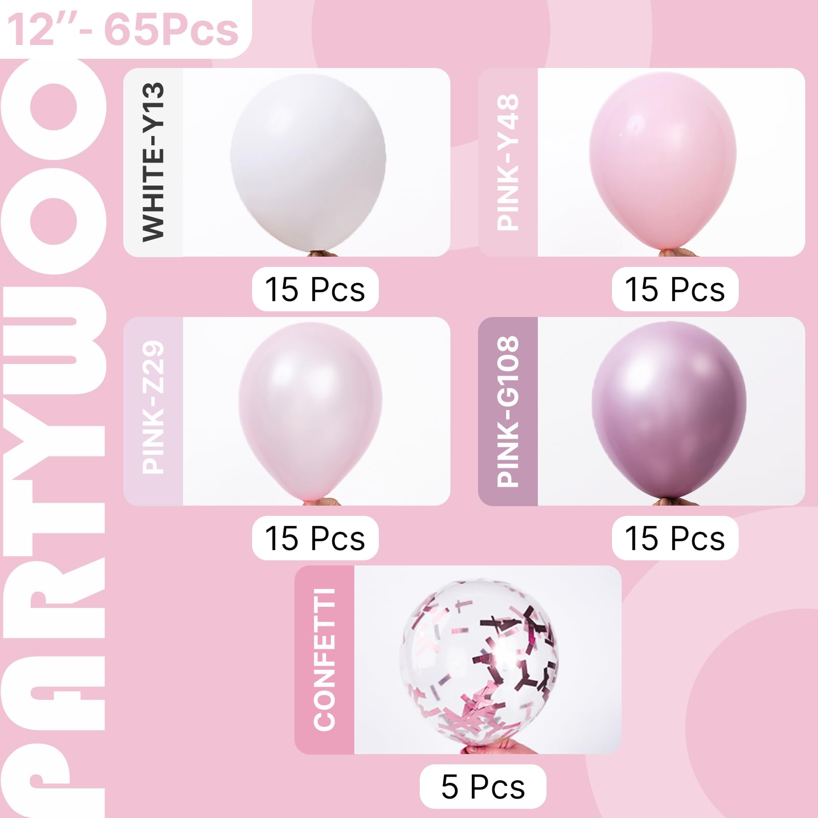 - Package includes: 12 inch white balloons (15 pcs), pearl pink balloons (15 pcs), metallic pink balloons (15 pcs) light pink balloons (15pcs) pink confetti balloons (5 pcs). These pink and white balloons can widely used in graduation, baby shower.