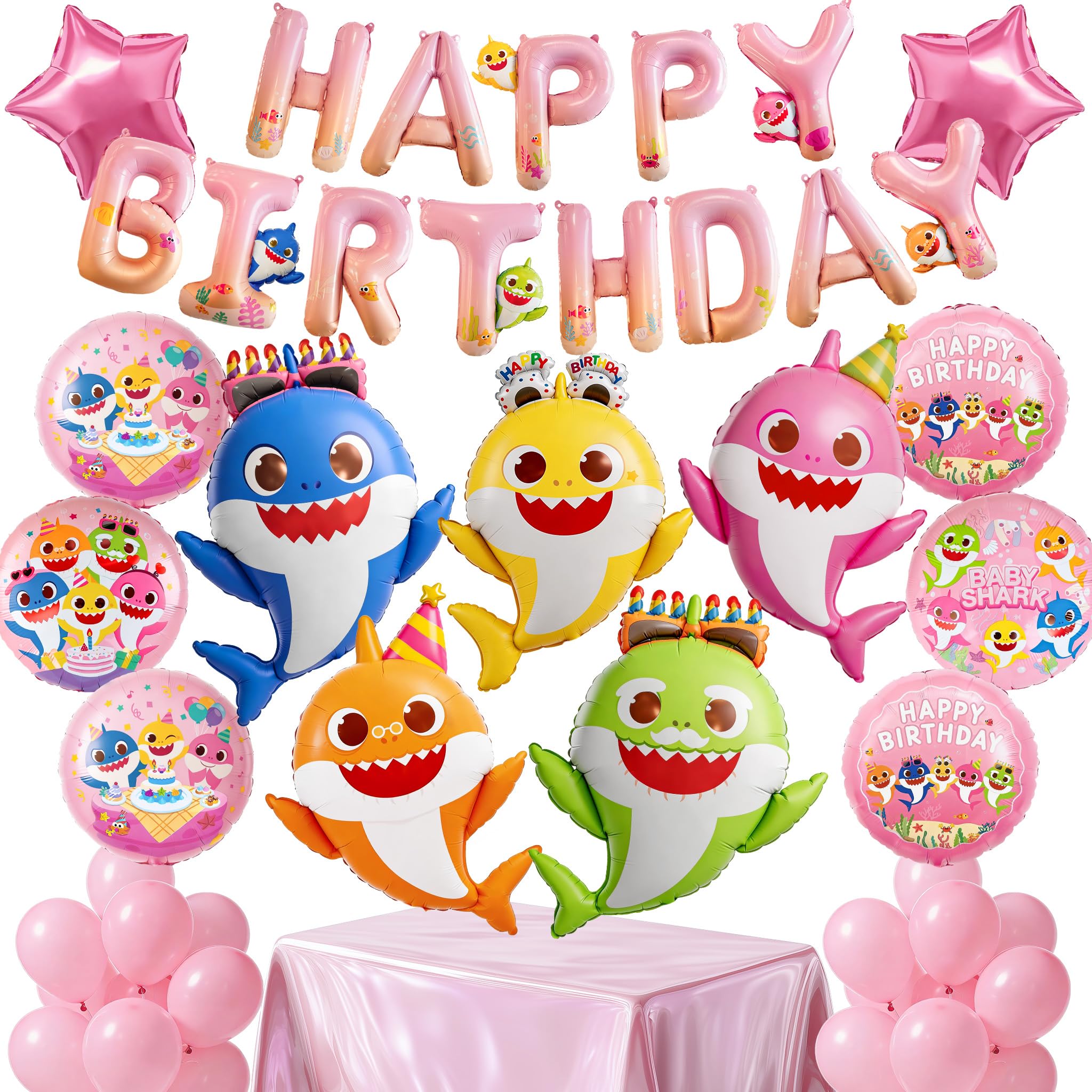 - Package includes: A total of 5pcs baby shark family balloons, 13 pink "Happy Birthday" letter balloons, 26pcs round pink balloons, 4pcs star pink balloons, in a solid consistent color.