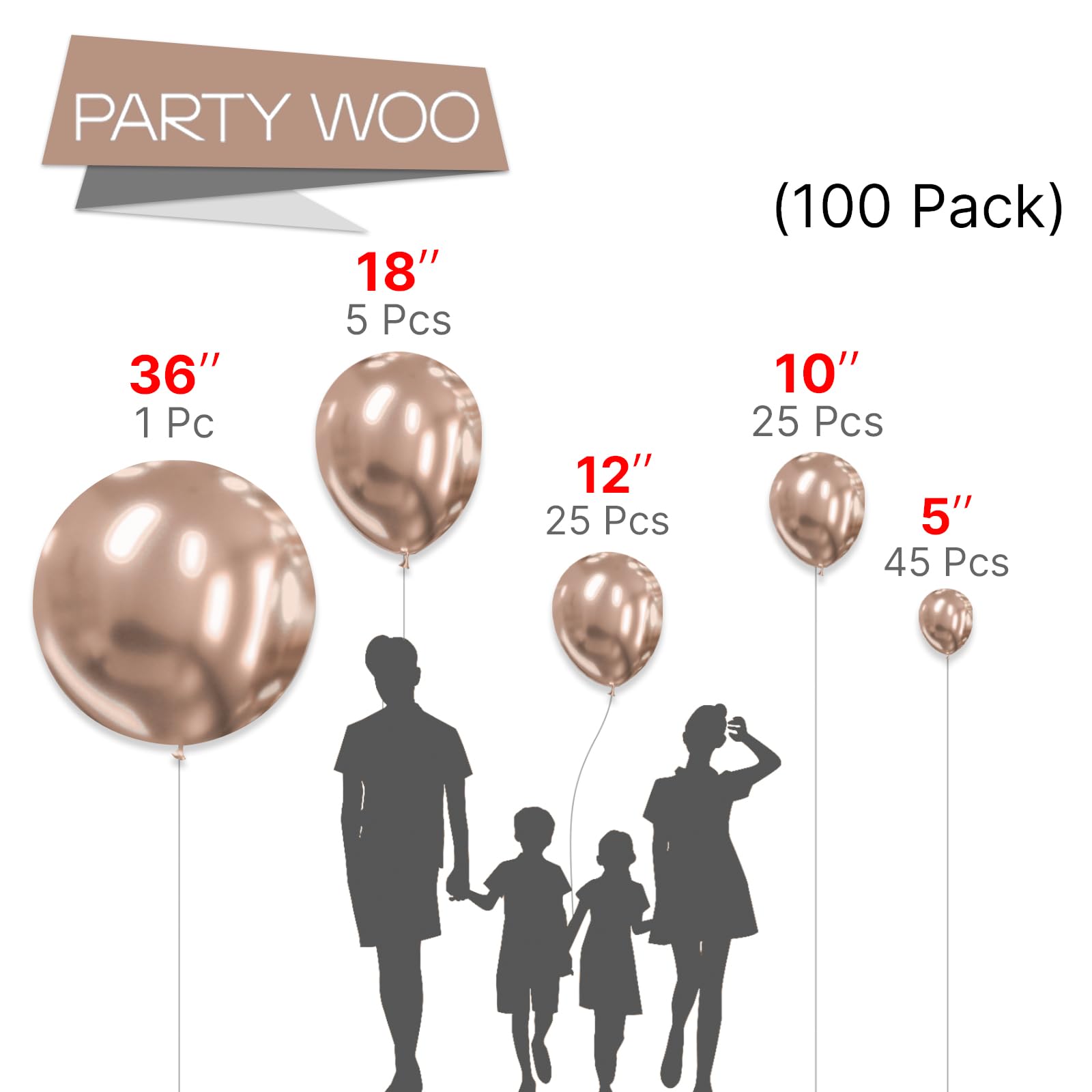 - 100 PCS METALLIC CHAMPAGNE GOLD BALLOONS DIFFERENT SIZES: Package includes 36 inch balloons (1 pc), 18 inch balloons (3 pcs), 12 inch balloons (20 pcs), 10 inch balloons (20 pcs), 5 inch balloons (56 pcs)
