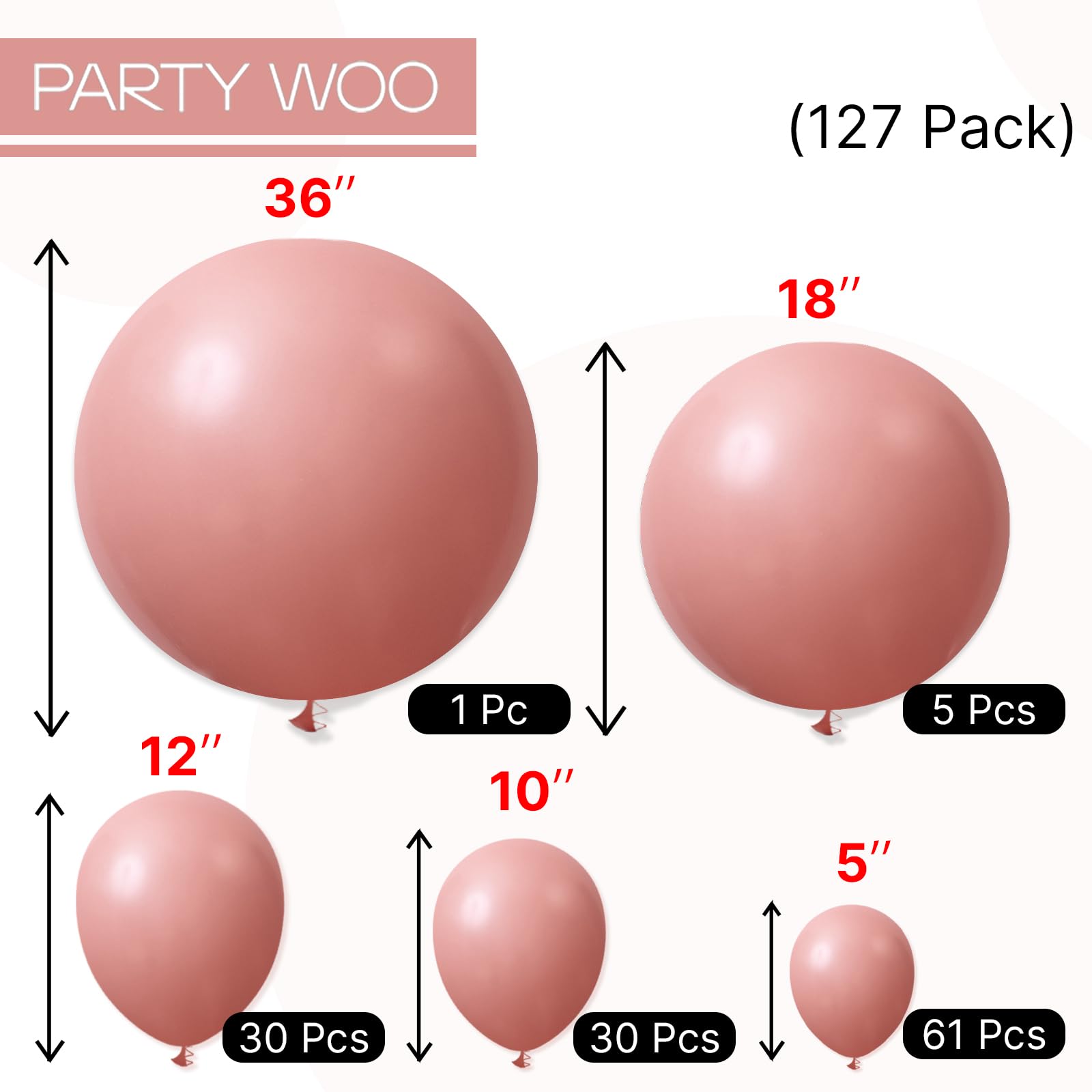 • Package includes: 36 inch dusty pink balloons (1pcs), 18 inch balloons (5pcs), 12 inch balloons (30pcs), 10 inch dusty pink balloons (30pcs), 5 inch dusty pink balloons (61pcs). Pay attentions the 5 inch balloons could NOT float when inflated with HELIUM.