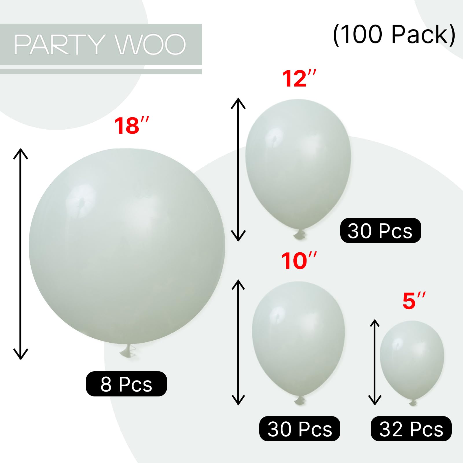 - Package includes: 18 inch dusty green balloons (8 pcs), 12 inch dusty green balloons (30 pcs), 10 inch dusty green balloons (30 pcs), 5 inch dusty green balloons (32 pcs), pay attentions that the 5 inch balloons could NOT float when inflated with HELIUM.