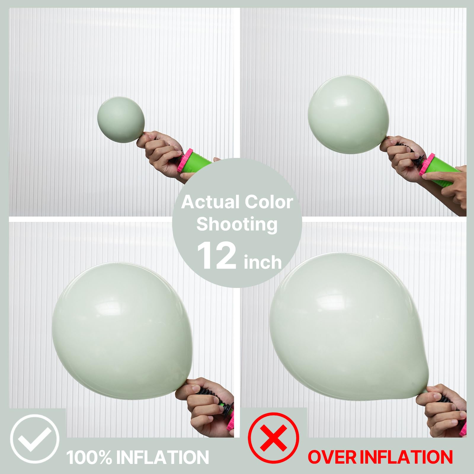 - Attention & Warning: Please DO NOT overfill the dusty green balloons and also avoid sunburn, overheat, pointed object and excessive friction. Control the amount of air inflated into each balloon to achieve your ideal balloon size and used in party.