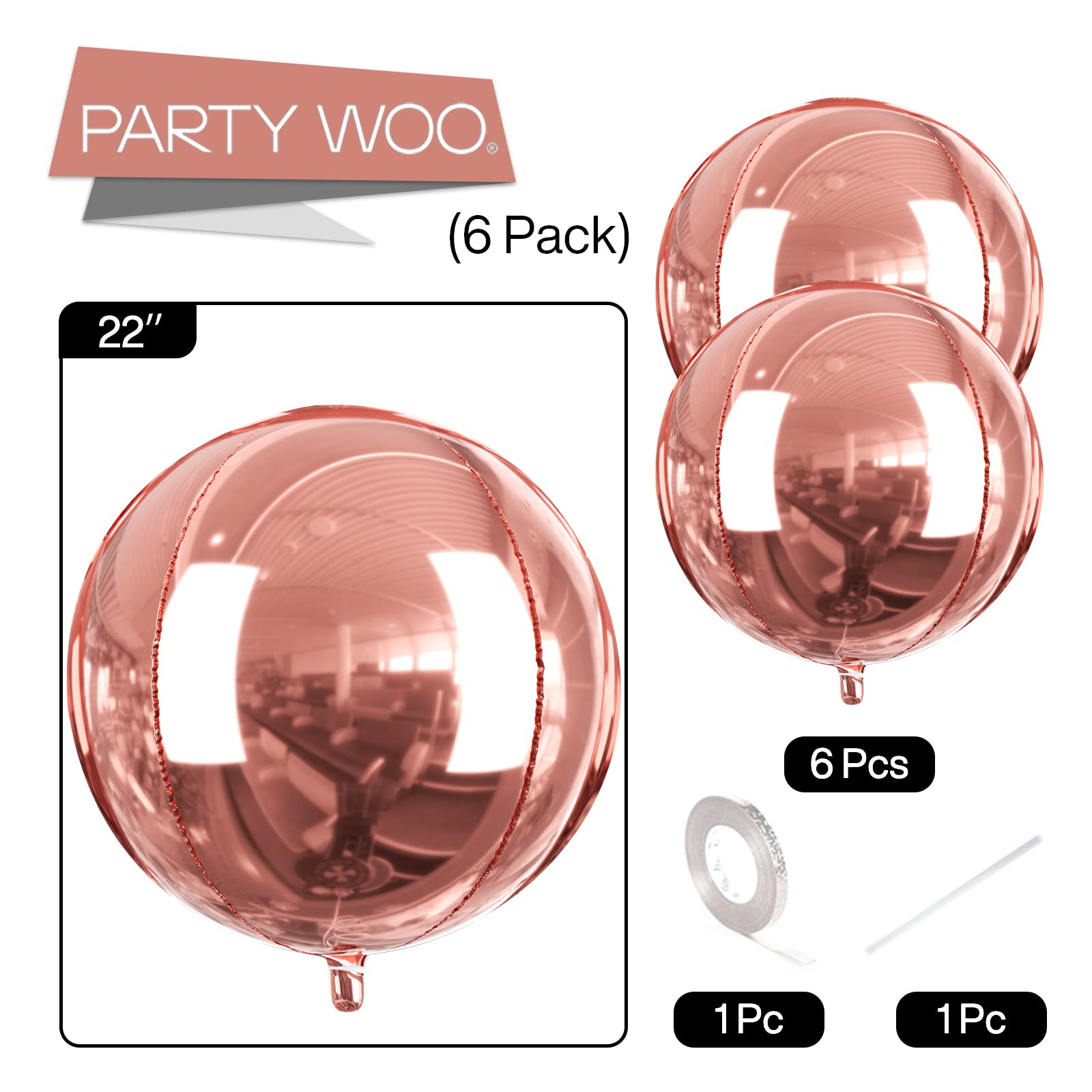 PartyWoo Rose Gold Foil Balloons 6pcs 22 Inch Large Round Foil Big Giant 4D Jumbo Inflatable Mirror Ball Mylar Balloons for Baby Shower Floral Birthday Wedding Bachelorette Party Decorations