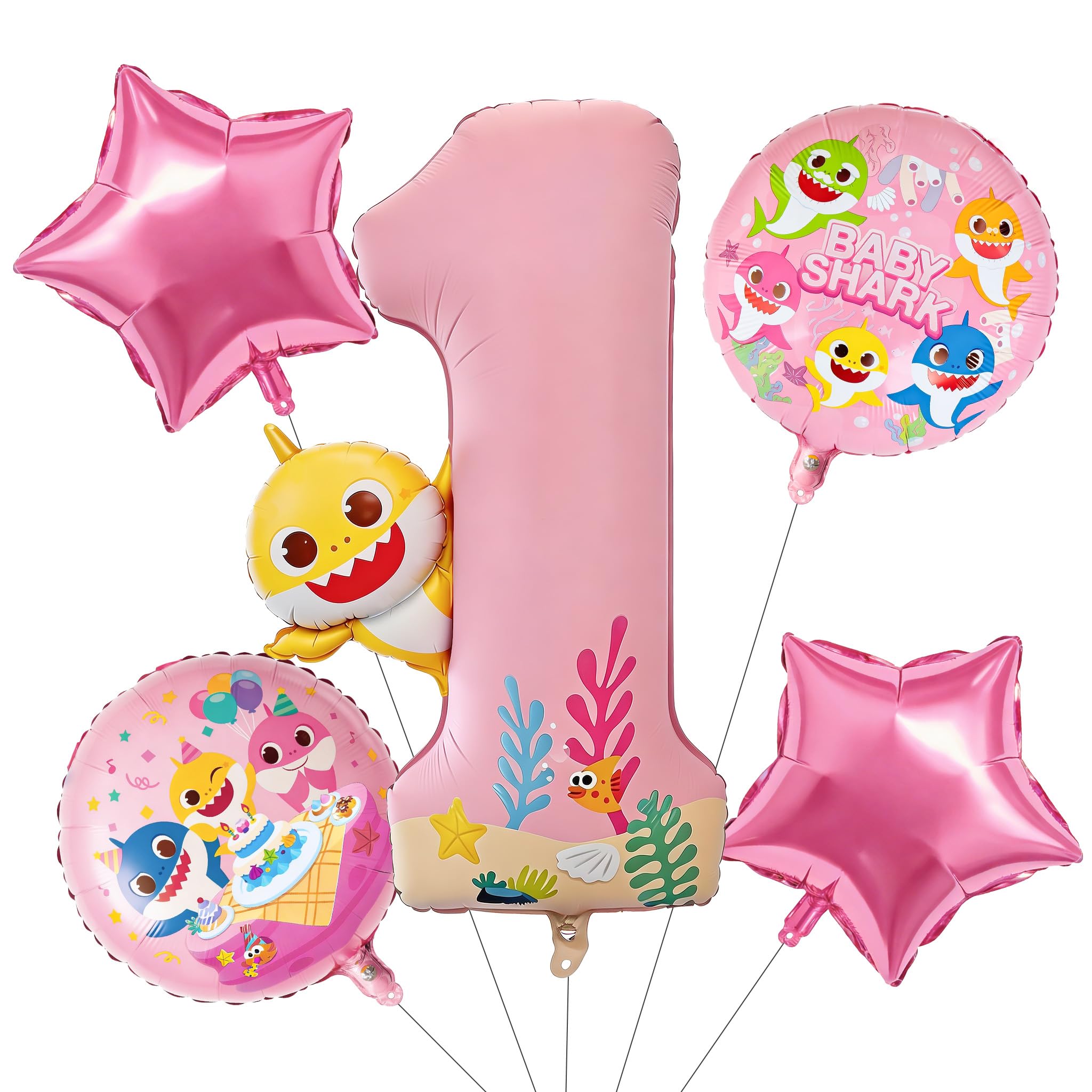 PartyWoo Baby Shark Pink Foil Number 1 Balloon 5pcs 40 18 Inch Pink Round Star Mylar Helium Birthday Balloons for Boys and Girls Baby Shark Under the Sea Ocean Kids First Birthday Party Decorations