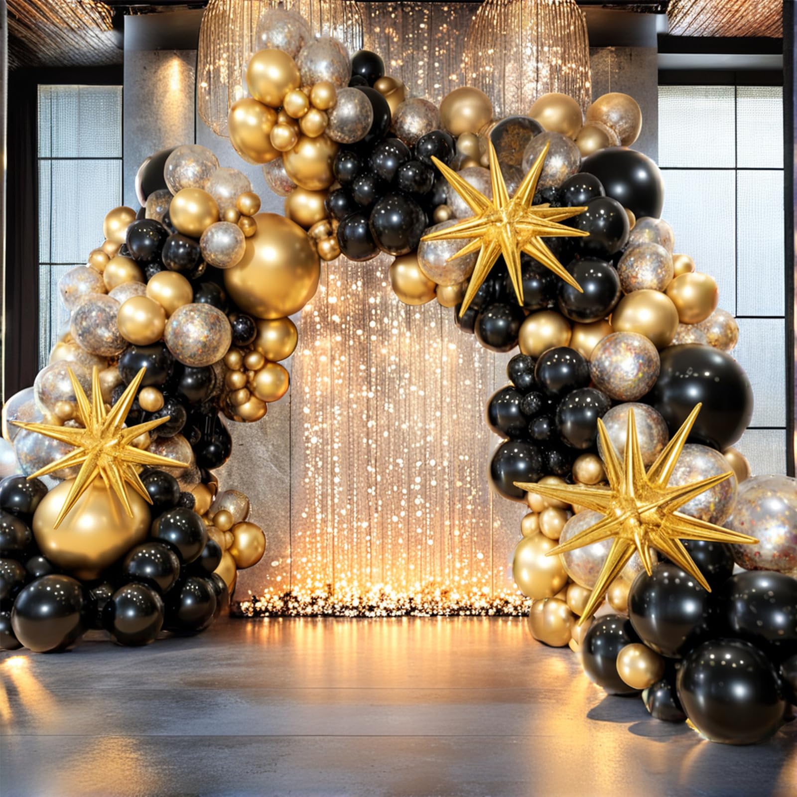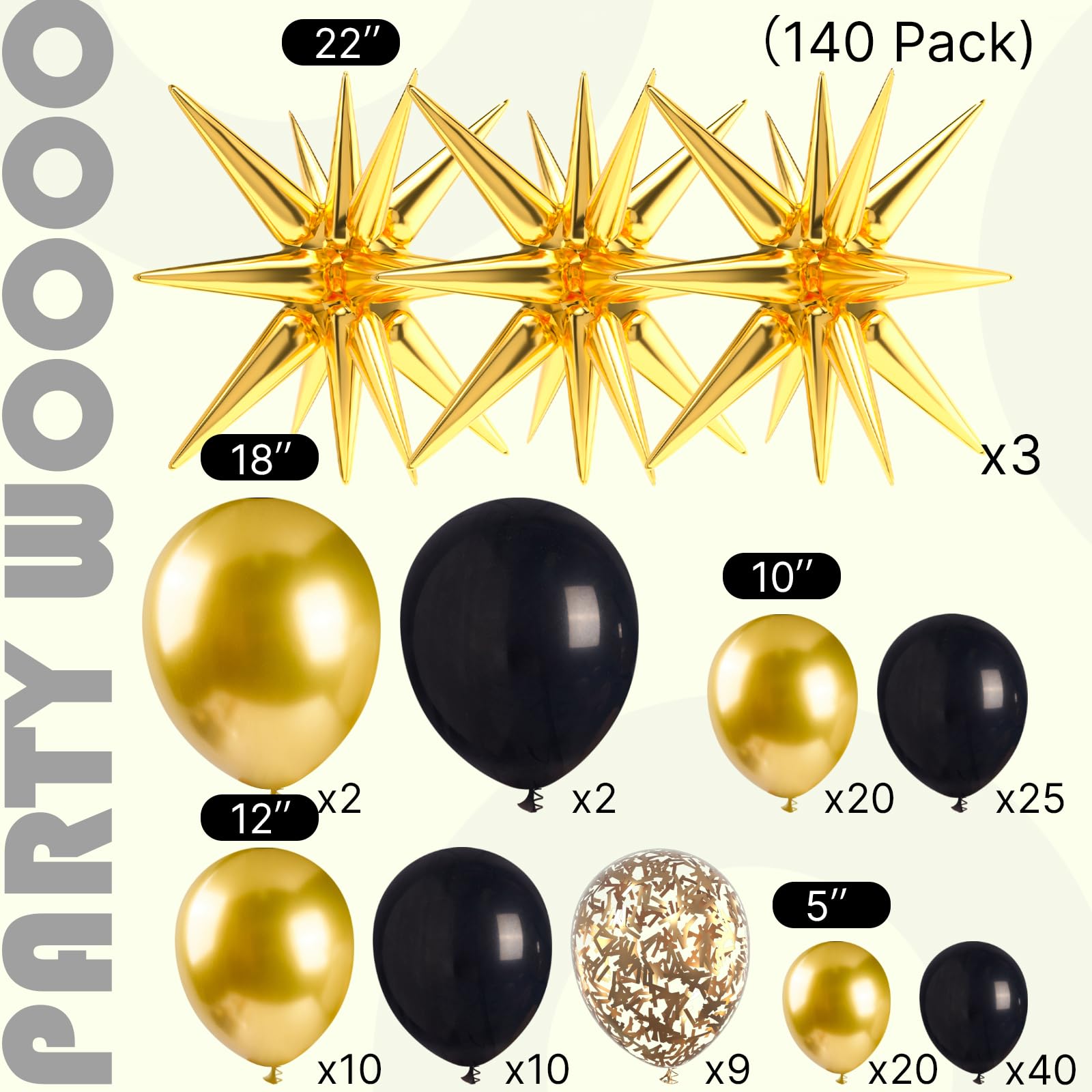 - Black and Gold Balloon Arch Kit: Includes gold star foil balloons (22"*3pcs), matte black balloons (18"*2pcs, 12"*10pcs, 10"*25pcs, 5"*40pcs), metallic gold balloons (18"*2pcs, 12"*10pcs, 10"*20pcs, 5"*20pcs), gold confetti balloons (12"*9pcs)