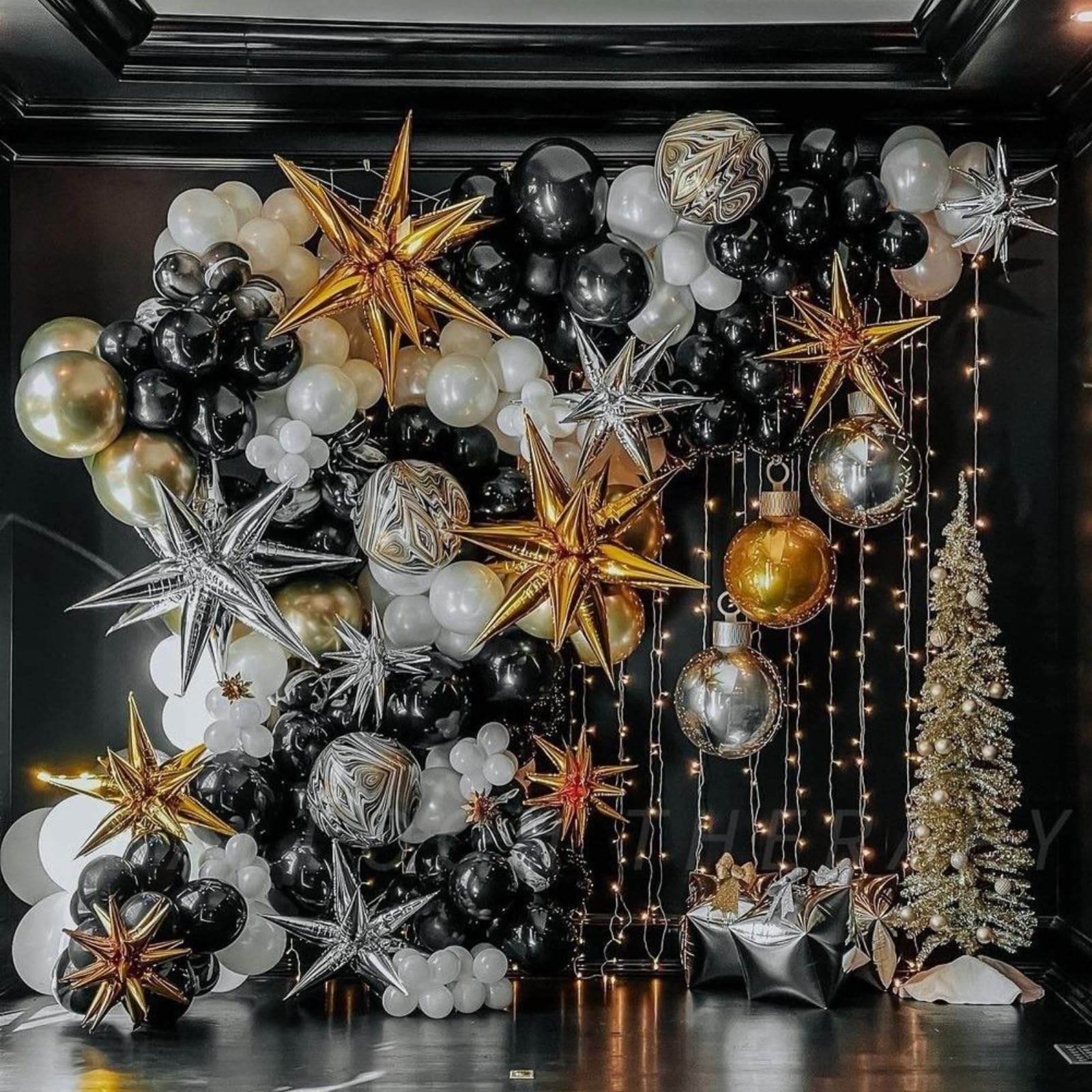 - Black and Gold Balloon Arch Kit: Includes gold star foil balloons (22"*3pcs), matte black balloons (18"*2pcs, 12"*10pcs, 10"*25pcs, 5"*40pcs), metallic gold balloons (18"*2pcs, 12"*10pcs, 10"*20pcs, 5"*20pcs), gold confetti balloons (12"*9pcs)