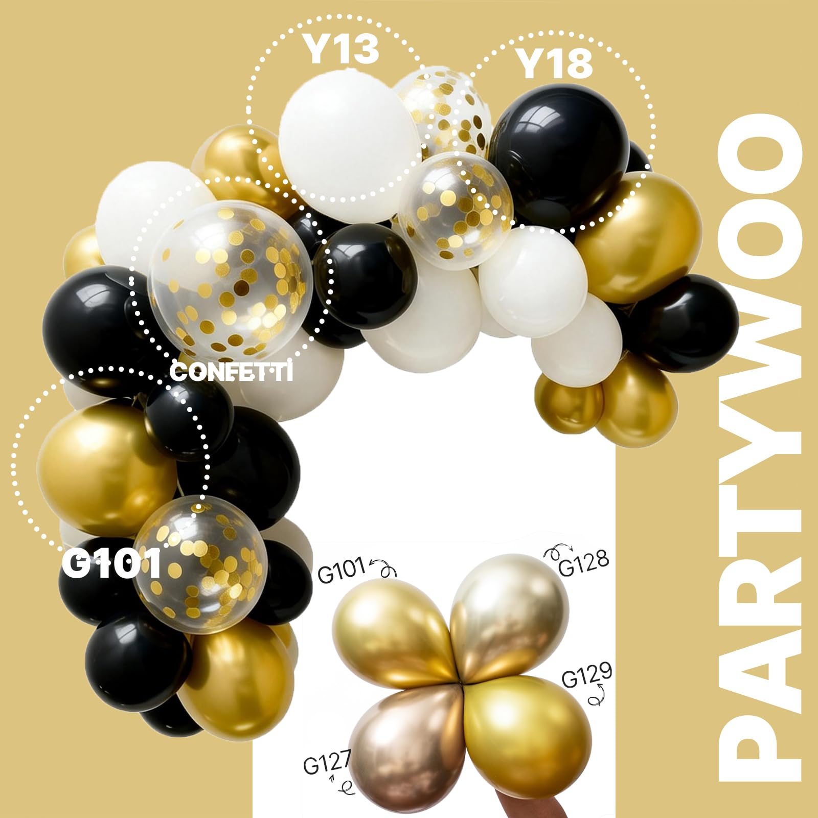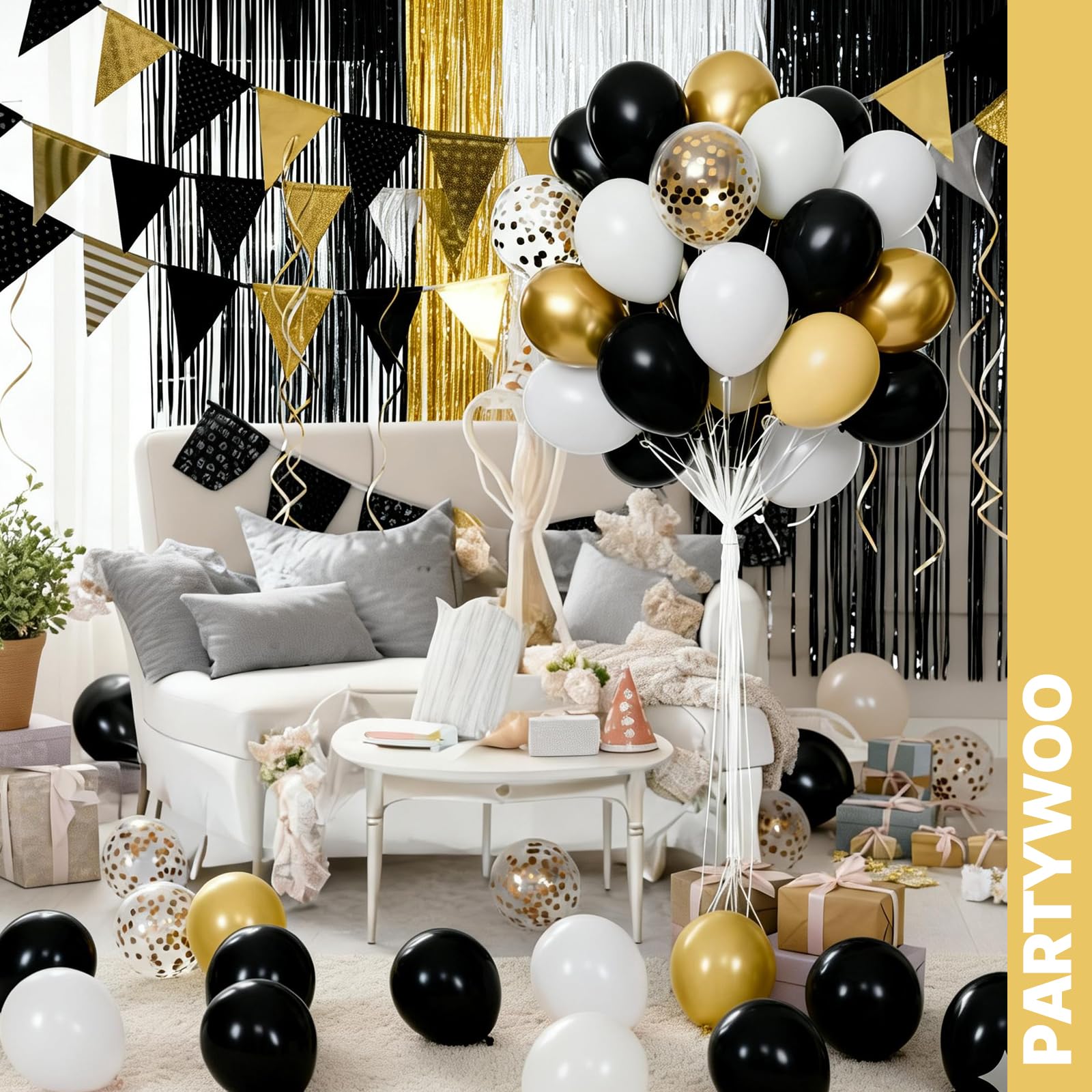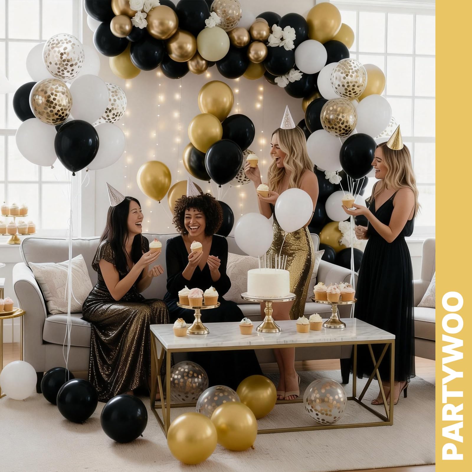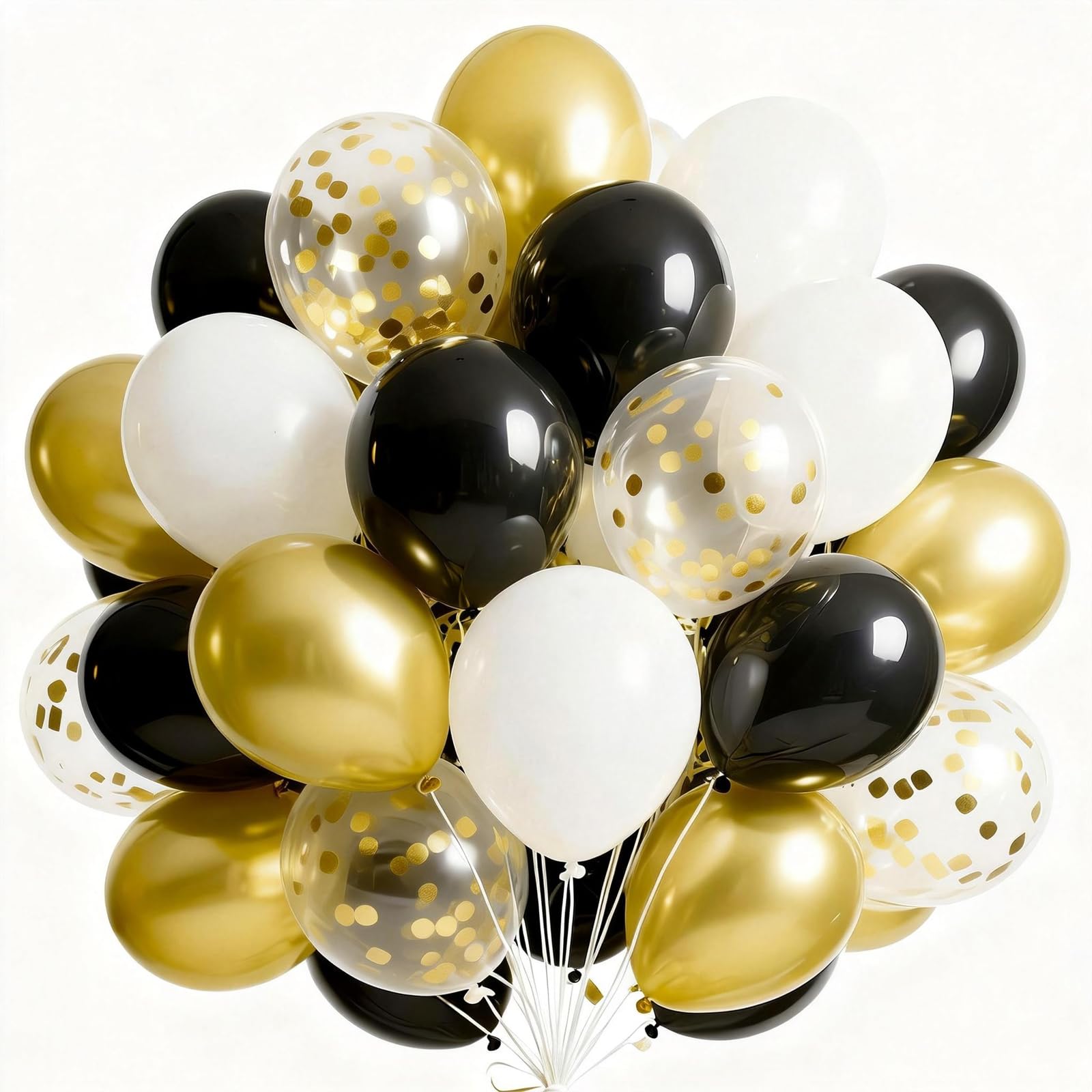 - Package includes: 12 inch black balloons (25 pcs), white balloons (15 pcs), metallic gold balloons (20 pcs), gold confetti balloons (5 pcs). These black and gold balloons can widely used in graduation, baby shower decorations, and make your party bright.