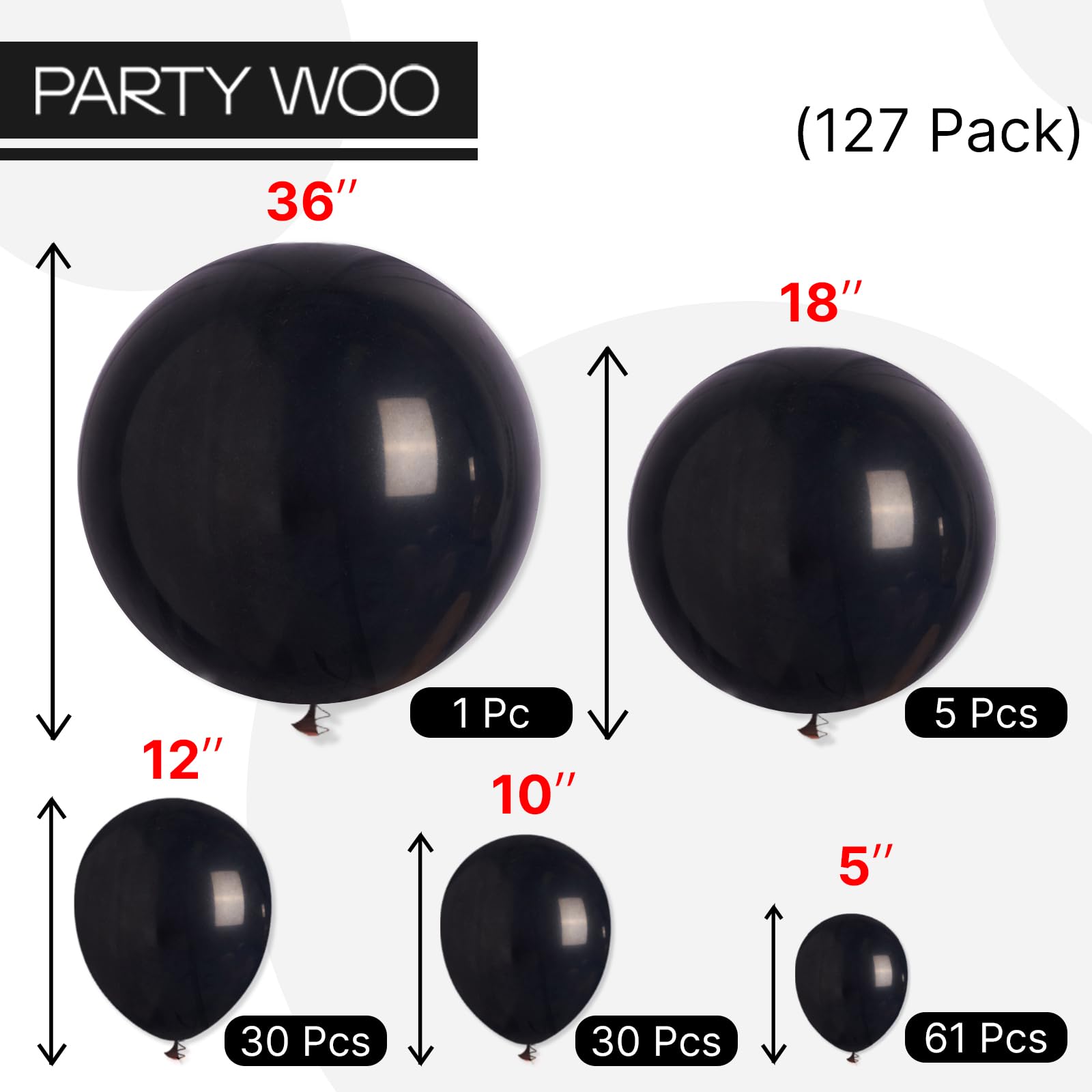 - Package includes: Total 127 pcs black balloons, including 36 inch (1 pc), 18 inch (5 pcs), 12 inch (30 pcs), 10 inch (30 pcs), 5 inch (61 pcs), suitable for parties, pay attentions that the 5 inch balloons could NOT float when inflated with HELIUM.