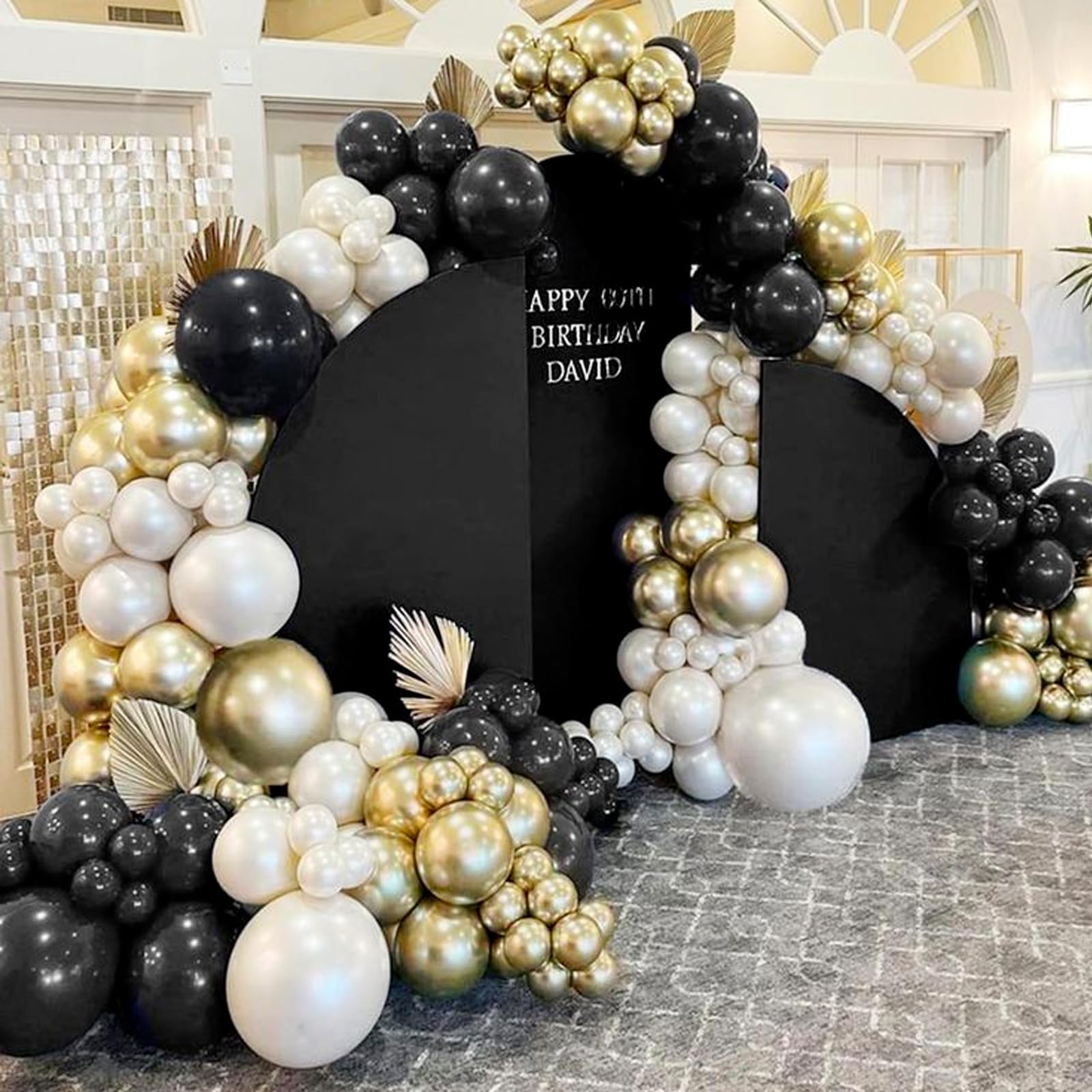 - 140 PCS BLACK GOLD WHITE BALLOONS DIFFERENT SIZES: Package includes 18 inch balloons 4 pcs, 12 inch balloons 30 pcs, 10 inch balloons 45 pcs, 5 inch small balloons 60 pcs, balloon decorating strip kit 1 set