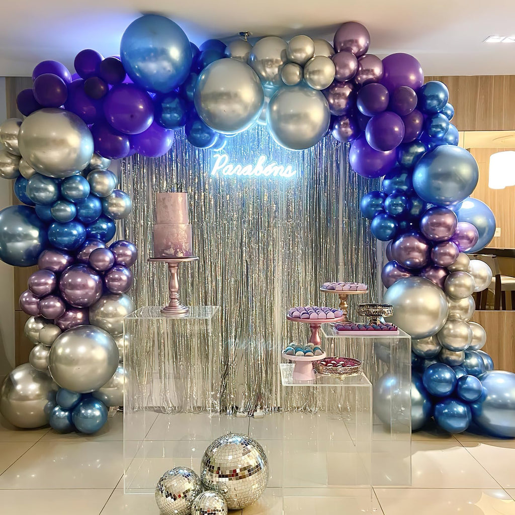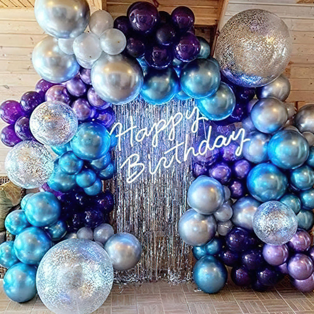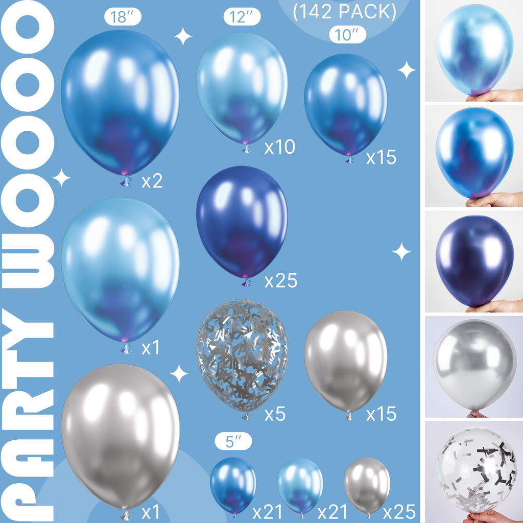 - 142 pcs BLUE SAHDES BALLOONS DIFFERENT SIZES: 18 inch balloons 4 pcs (metallic light blue x1, metallic silver x1, metallic blue x2, ), 12 inch balloons 25 pcs (silver confetti x5, metallic light blue x10, metallic navy blue x10), 10 inch balloons 45 pcs (metallic blue x15, metallic silver x15, metallic navy blue x15), 5 inch small balloons 67 pcs (metallic silver x25, metallic blue x21, metallic light blue x21), garland kit and manual included