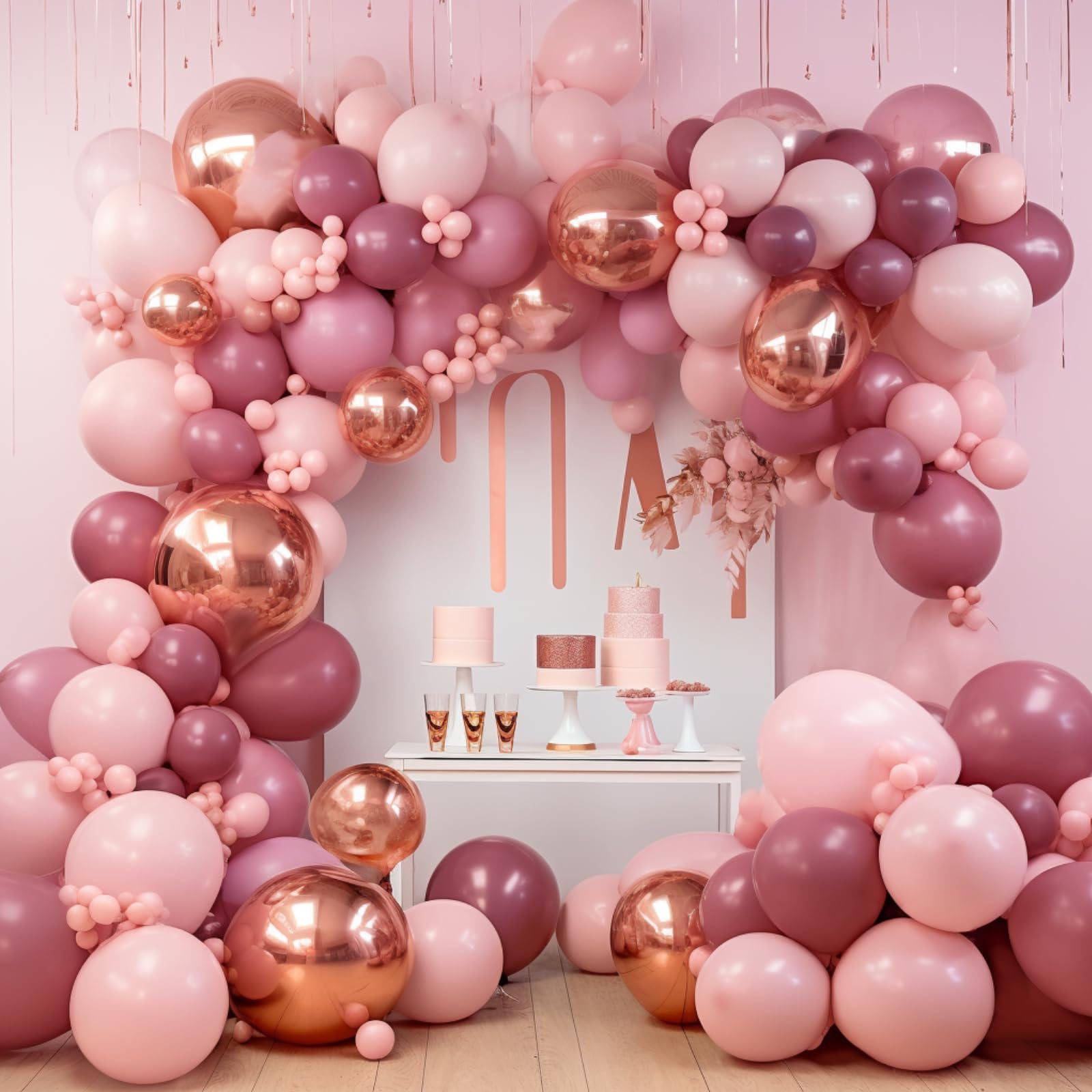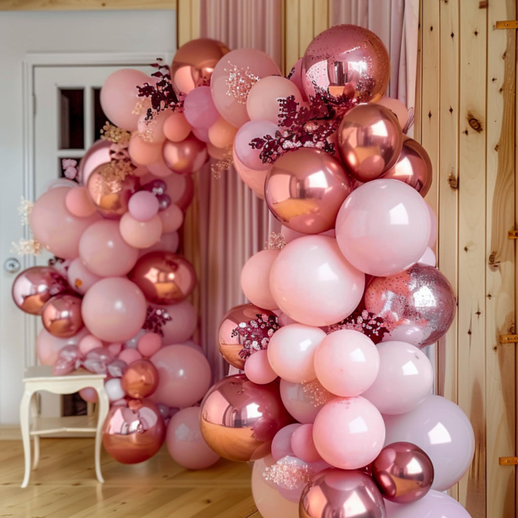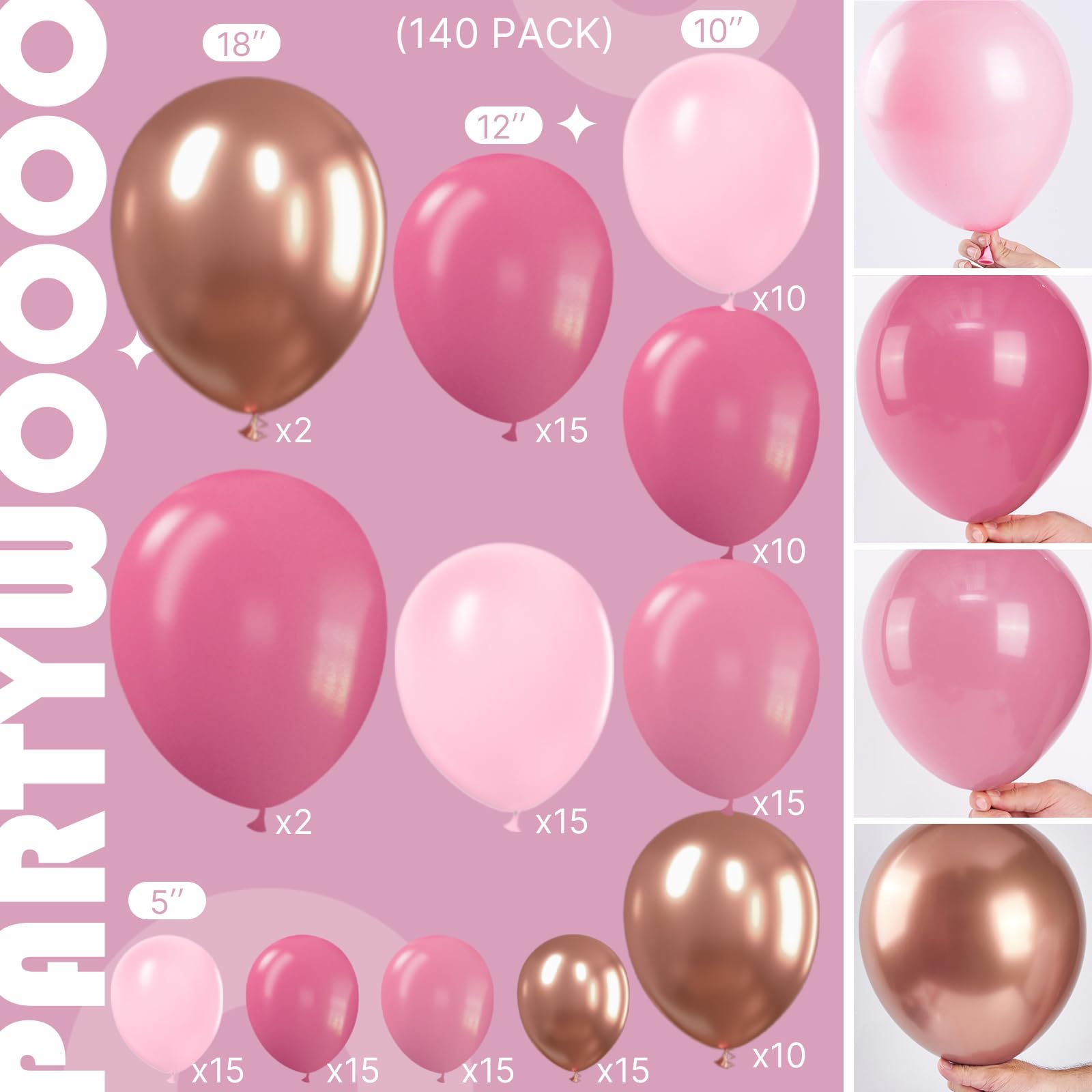 - 140 PCS PINK AND ROSE GOLD BALLOONS DIFFERENT SIZES: Package includes 18 inch balloons 4 pcs, 12 inch balloons 30 pcs, 10 inch balloons 45 pcs, 5 inch small balloons 60 pcs, balloon decorating strip kit 1 set
