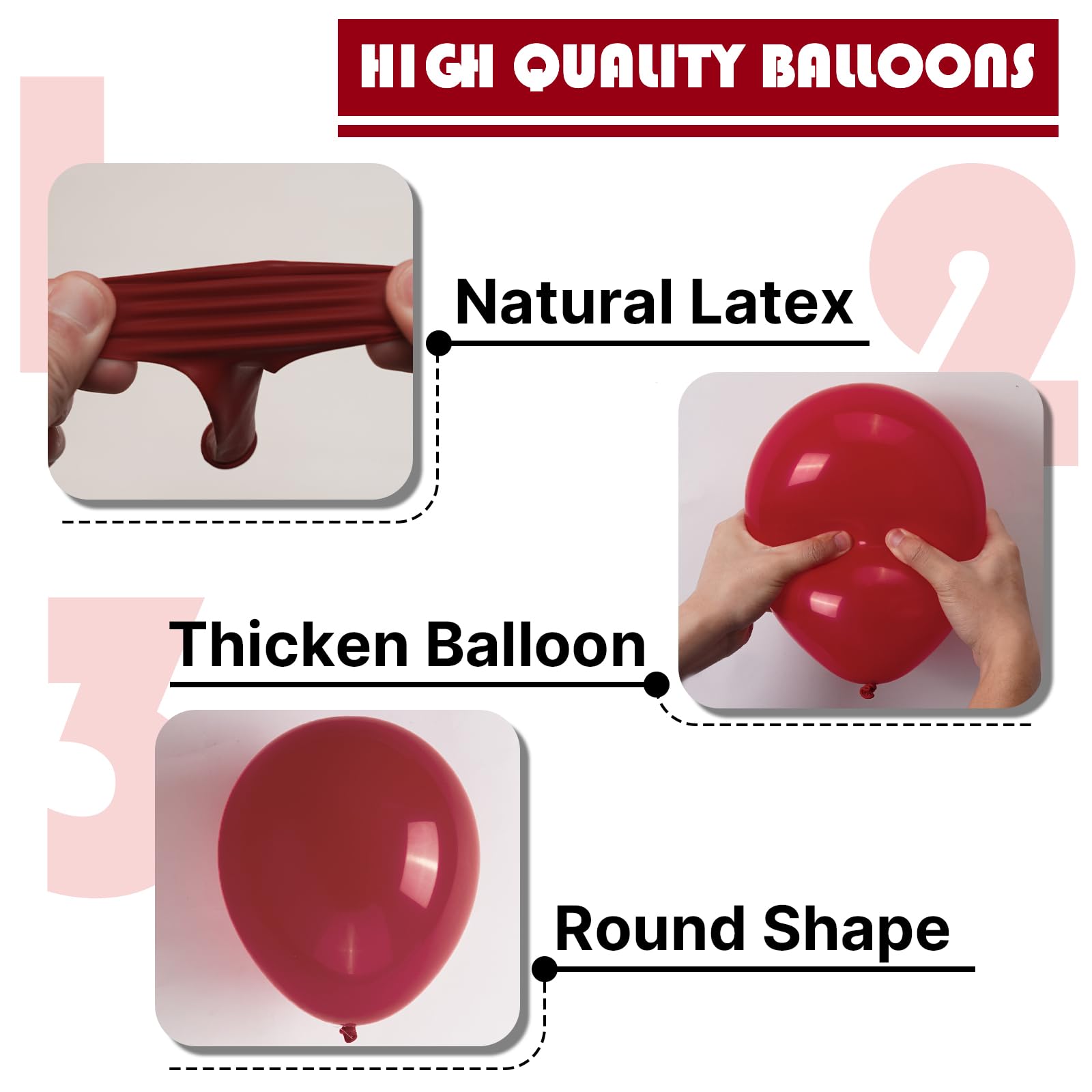- Attention & Warning: Please DO NOT overfill the maroon balloons and also avoid sunburn, overheat, pointed object and excessive friction. Control the amount of air inflated into each balloon to achieve your ideal balloon size, enjoy your birthday party.