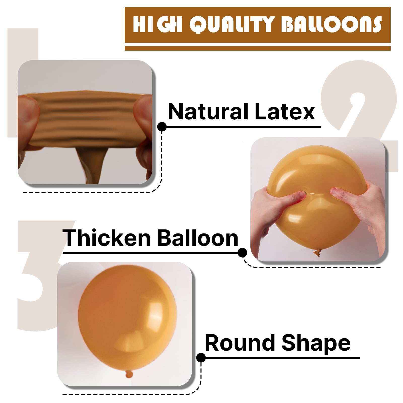 - 100 PCS LIGHT BROWN BALLOONS DIFFERENT SIZES: The package comes with 18 inch light brown balloons (8 pcs), 12 inch light brown balloons (20 pcs), 10 inch light brown balloons (30 pcs), 5 inch light brown balloons (32 pcs)