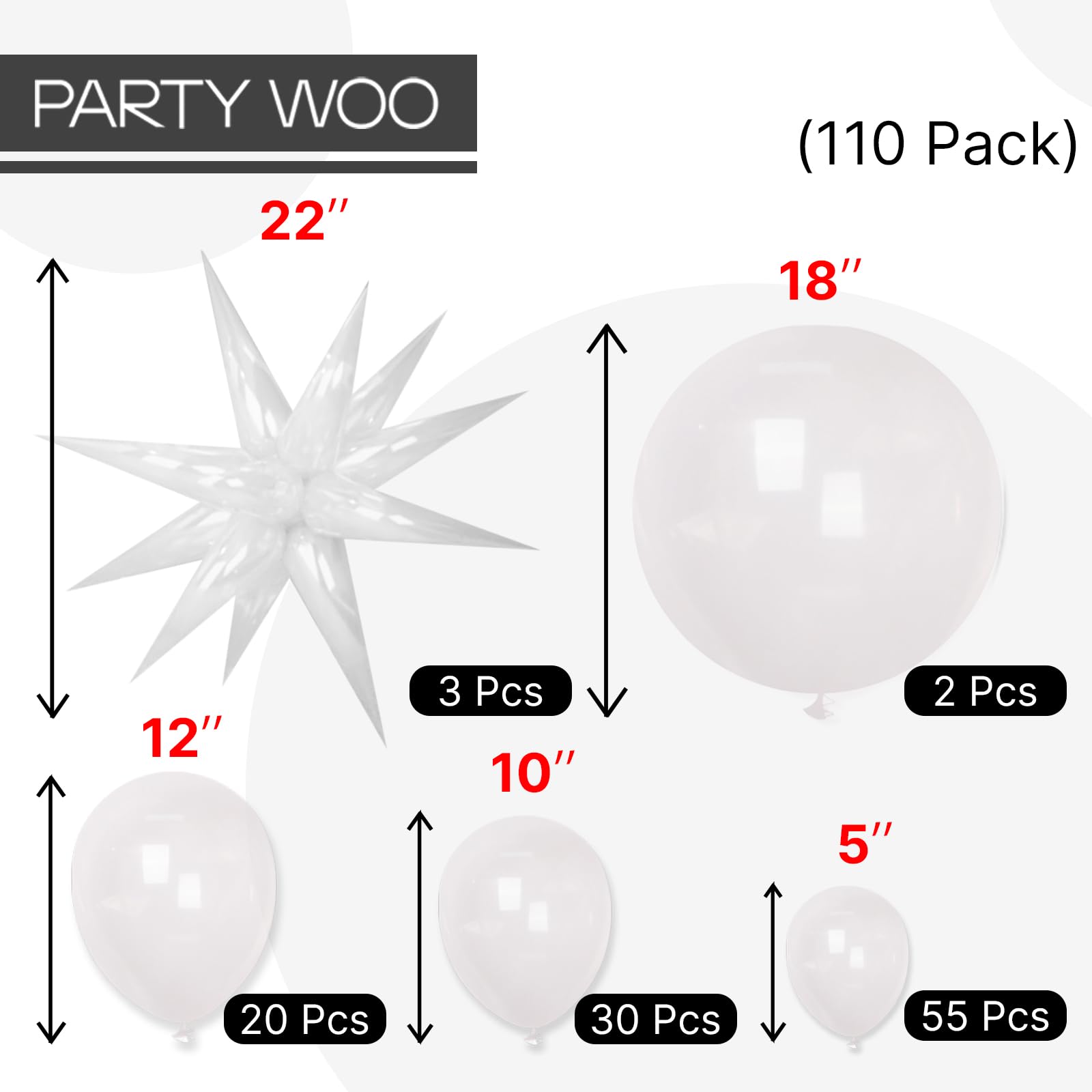 - Package Include:22 inch foil star balloons (3pcs), 18 inch balloons (2pcs), 12 inch balloons (20pcs), 10 inch balloons (30pcs), 5 inch balloons (55pcs), ribbon (1pc) and inflation straw (1pc). Which is enough for your birthday and party decorations