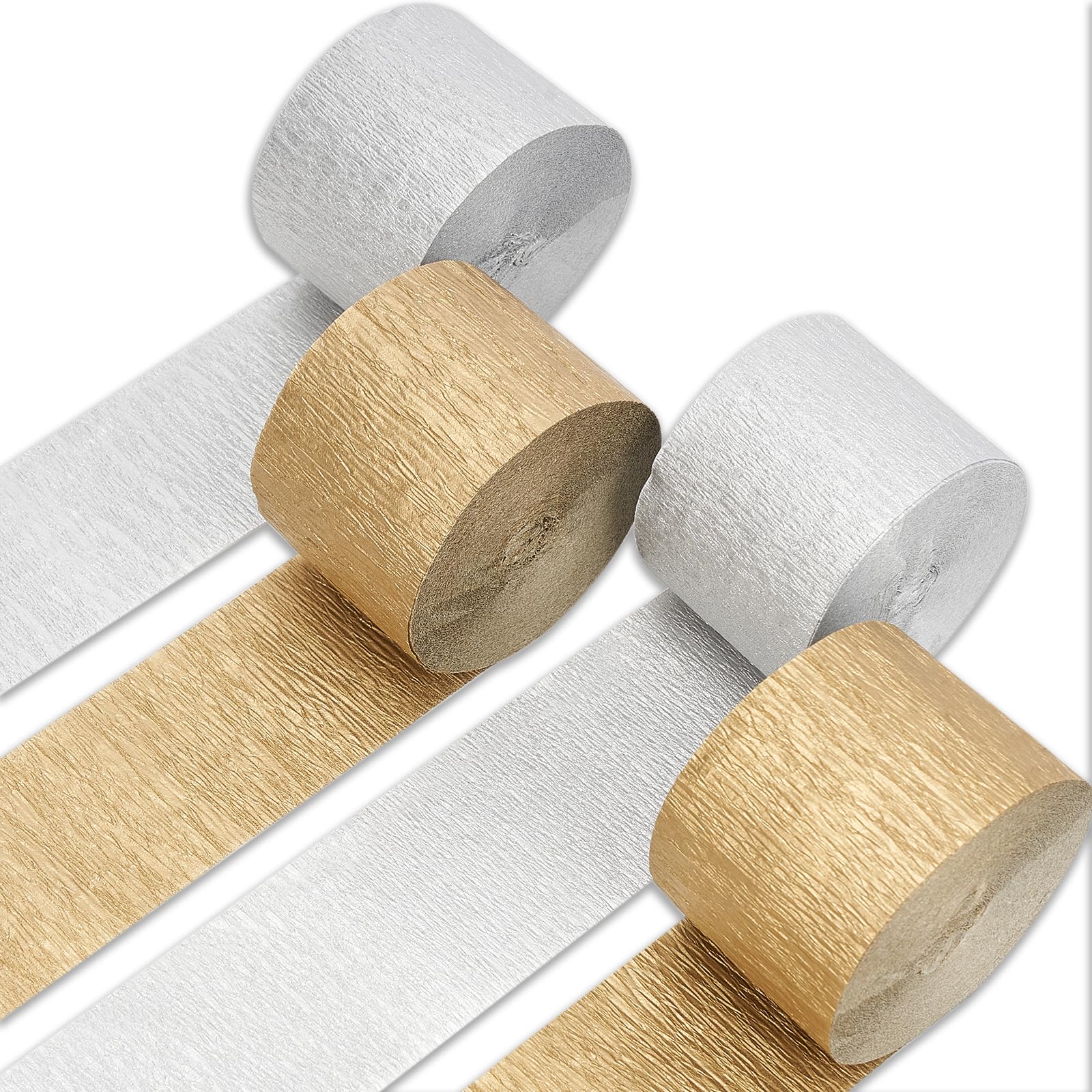 - Package Included:You will receive 4 precisely rolled party crepe paper in gold and silver color, each roll is 1.8 inch x 82 ft, these crepe paper streamer rolls are enough for your baby shower decorations, bachelorette and birthday party decoration need