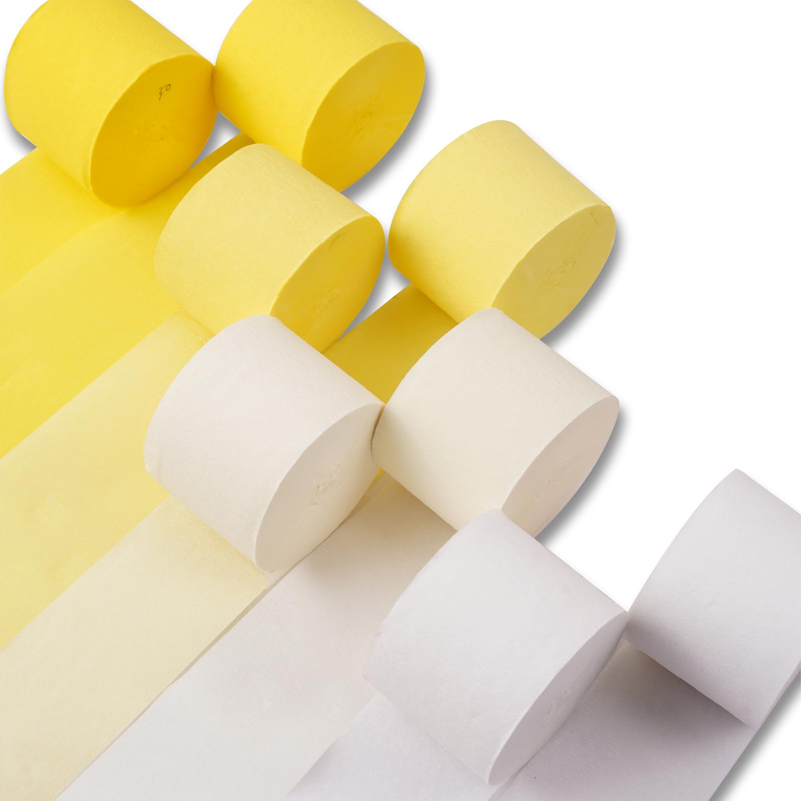 - Package Included:You will receive 8 precisely rolled party crepe paper in yellow and white colors, each roll is 1.8 inch x 82 ft, these crepe paper streamer rolls are enough for your baby shower decorations, wedding and engagement decoration needs
