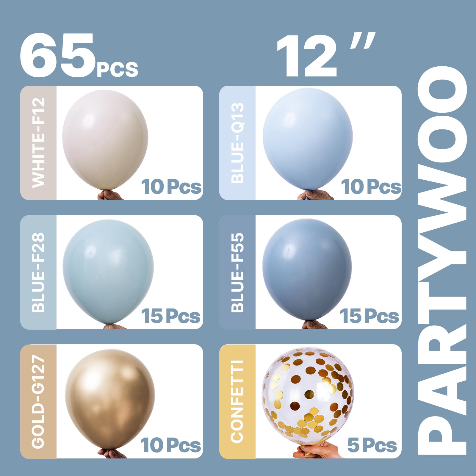 - Package includes: 12 inch dusty blue balloons (15 pcs), slate blue balloons(15pcs), baby blue balloons(15pcs), white sand balloons(10pcs), metallic gold balloons (10 pcs), gold confetti balloons (5 pcs). These dusty blue balloons can widely used in party.