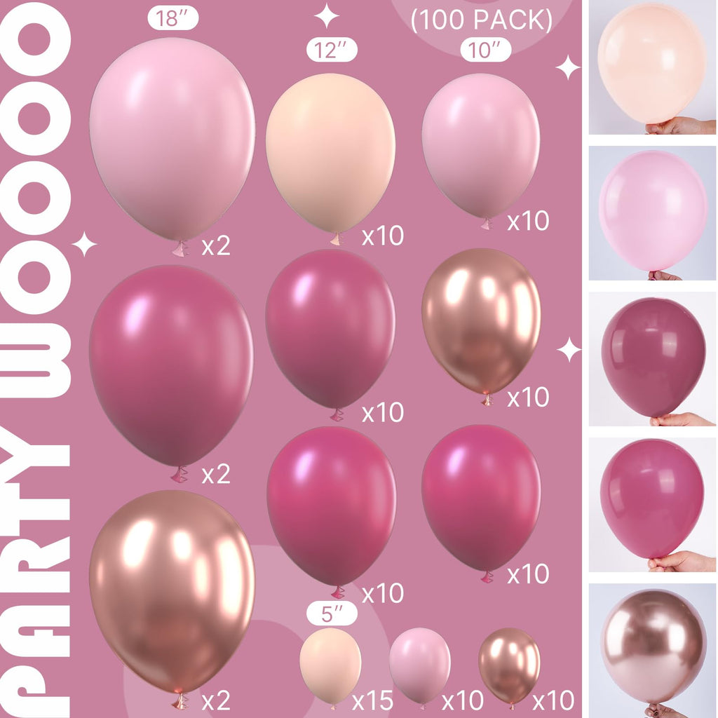 - 100 PCS PINK BALLOONS DIFFERENT SIZES: 18 inch balloons 6 pcs (pink x2, dark pink x2, metallic rose gold x2), 12 inch balloons 30 pcs (pastel pink x10, dark pink x10, deep pink x10), 10 inch balloons 30 pcs (deep pink x10, metallic rose gold x10, pink x10), 5 inch small balloons 35 pcs (pastel pink x15, pink x10, metallic rose gold x10), 8.2ft/ 2.5m balloon decorating strip (1)