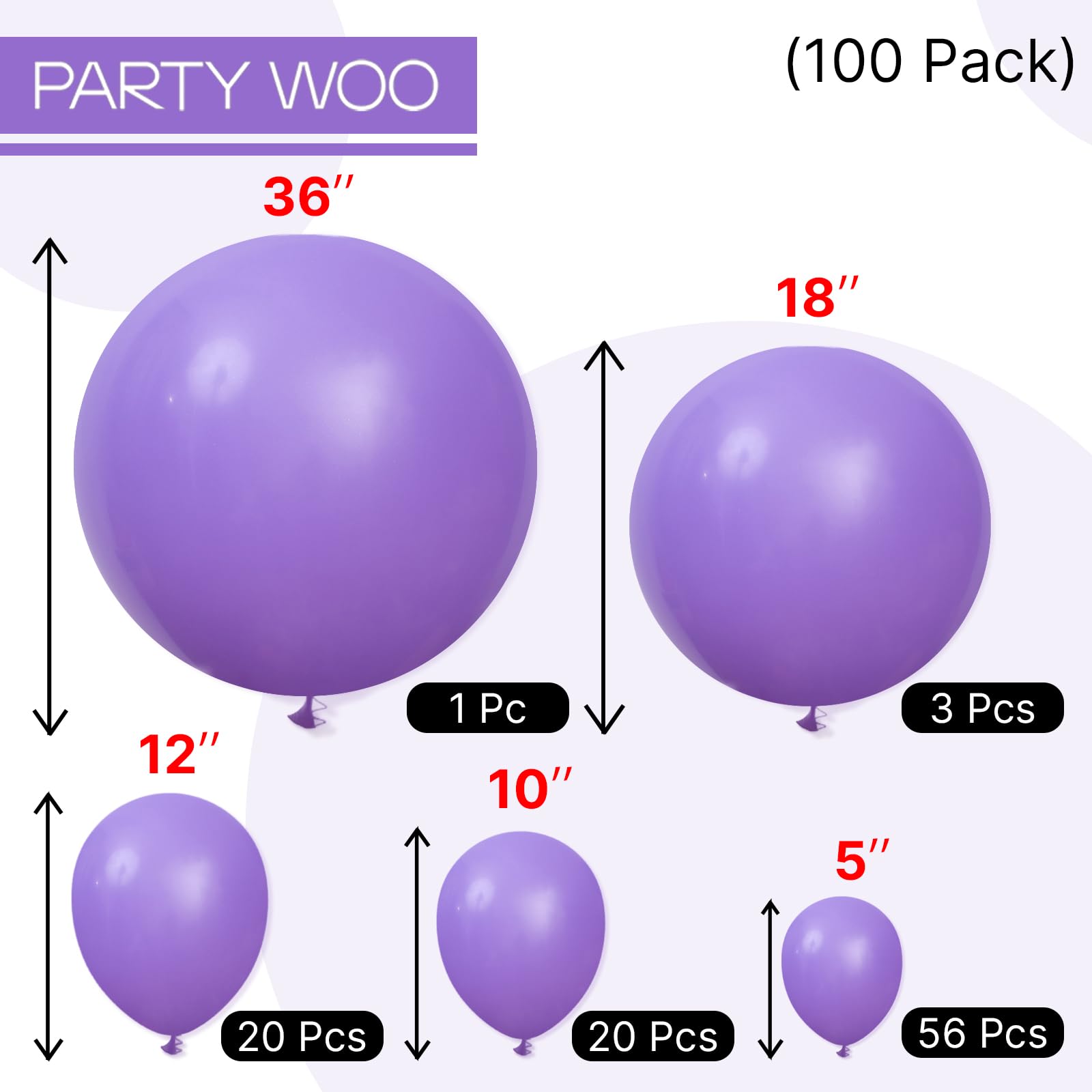 - 100 PCS PURPLE BALLOONS DIFFERENT SIZES: Package includes 36 inch balloon (1 pc), 18 inch balloons (3 pcs), 12 inch balloons (20 pcs), 10 inch balloons (20 pcs), 5 inch balloons (56 pcs)