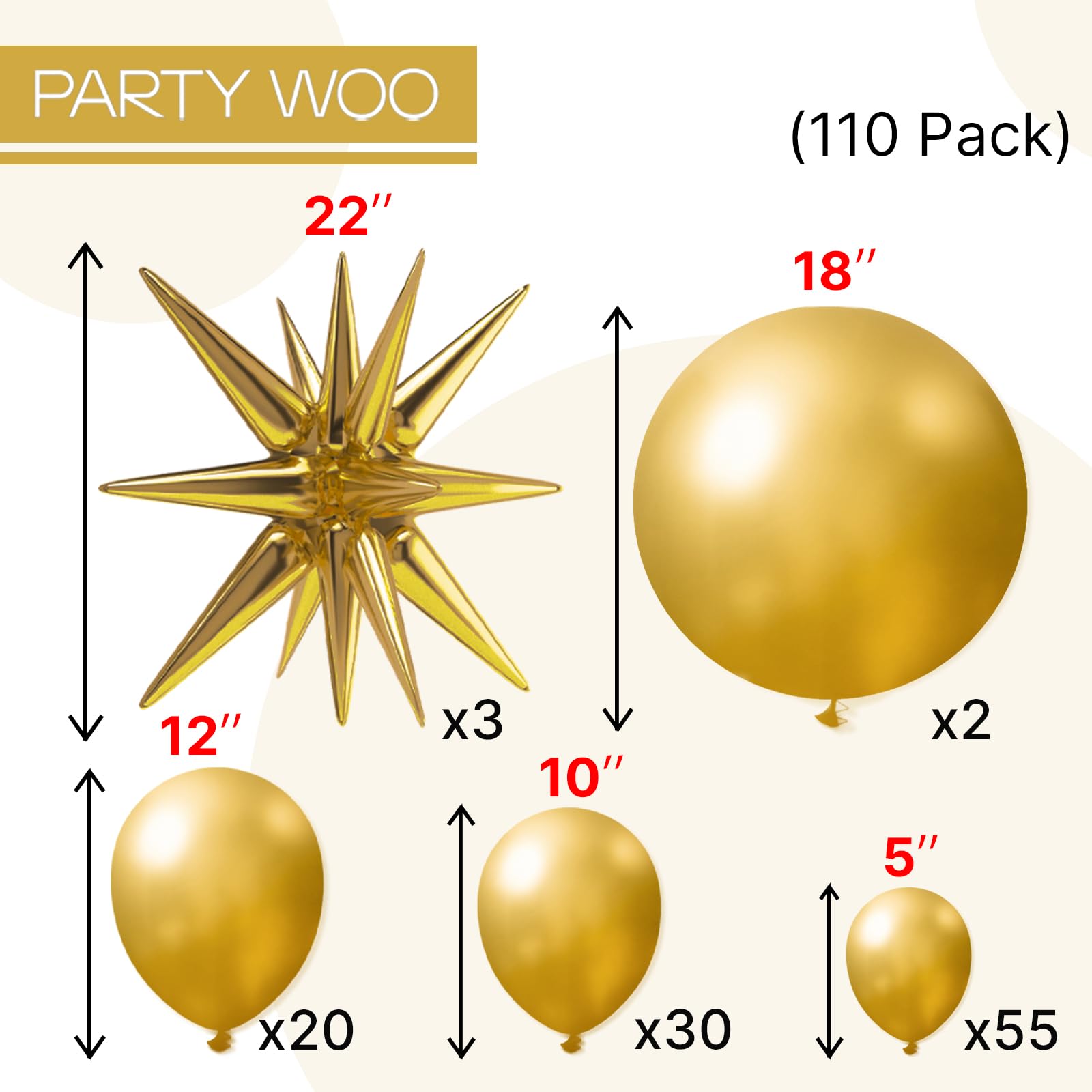- Package Include:22 inch foil star balloons (3pcs), 18 inch balloons (2pcs), 12 inch balloons (20pcs), 10 inch balloons (30pcs), 5 inch balloons (55pcs), ribbon (1pc) and inflation straw (1pc). Which is enough for your birthday and party decorations