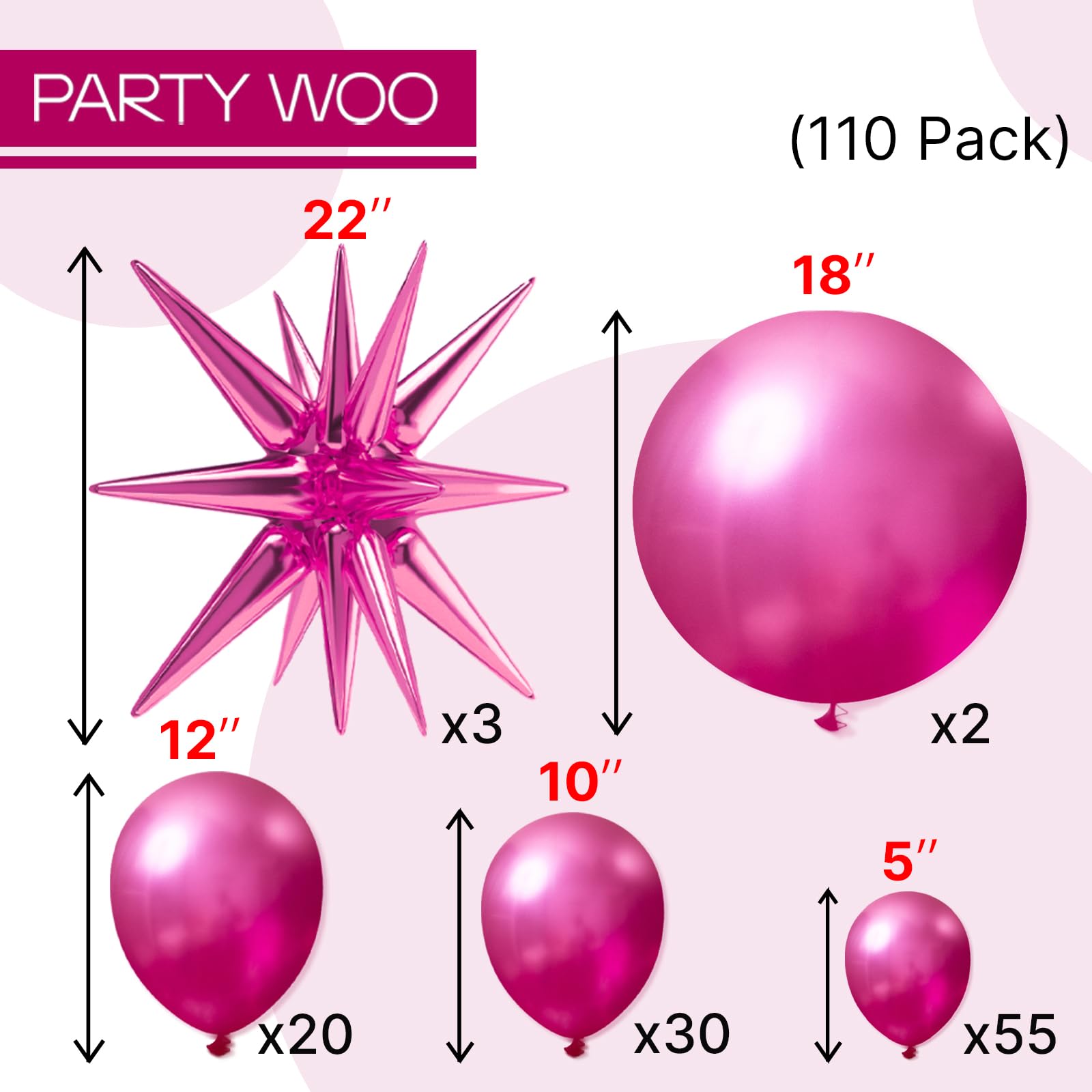 - Package Include:22 inch foil star balloons (3pcs), 18 inch balloons (2pcs), 12 inch balloons (20pcs), 10 inch balloons (30pcs), 5 inch balloons (55pcs), ribbon (1pc) and inflation straw (1pc). Which is enough for your birthday and party decorations