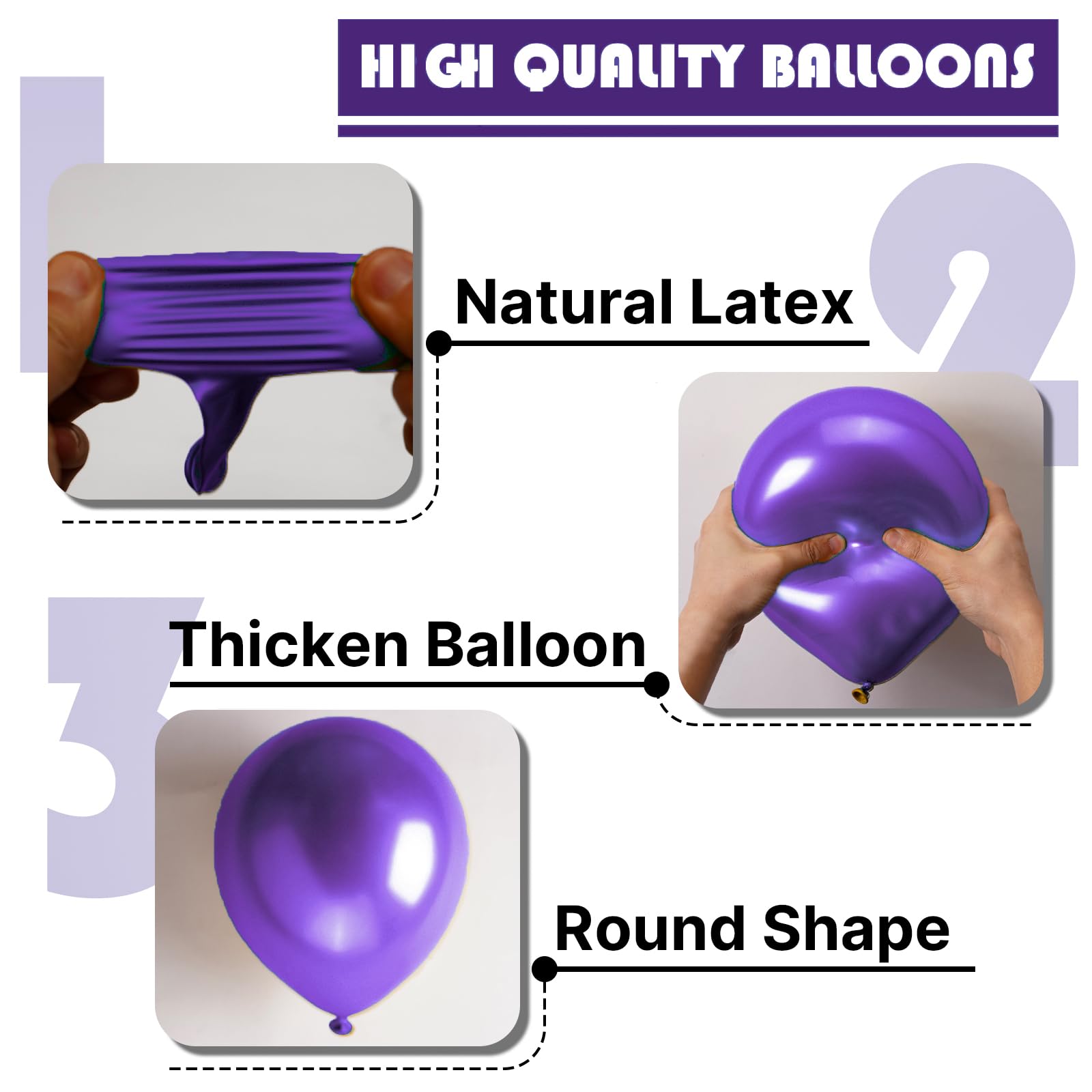 - Attention & Warning: Please DO NOT overfill the metallic purple balloons and avoid sunburn, overheat, pointed object and excessive friction. Control the amount of air inflated into each balloon to achieve your ideal balloon size and widely used in party.