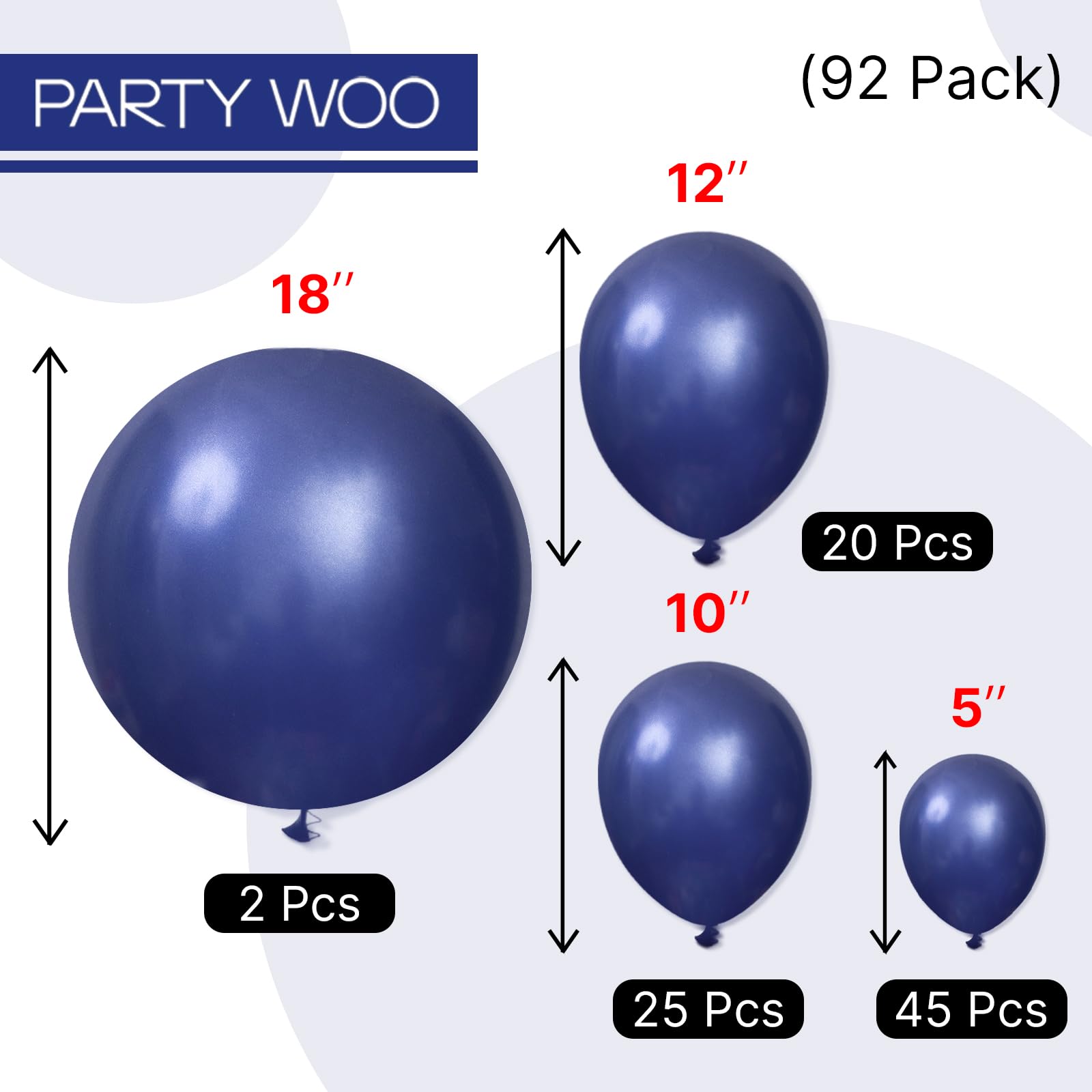 - Package includes: 18 inch navy blue balloons (2pcs), 12 inch navy blue balloons (20pcs), 10 inch navy blue balloons (25pcs), 5 inch navy blue balloons (45pcs).Please pay attention that the 5 inch balloons could NOT float when inflated with HELIUM.