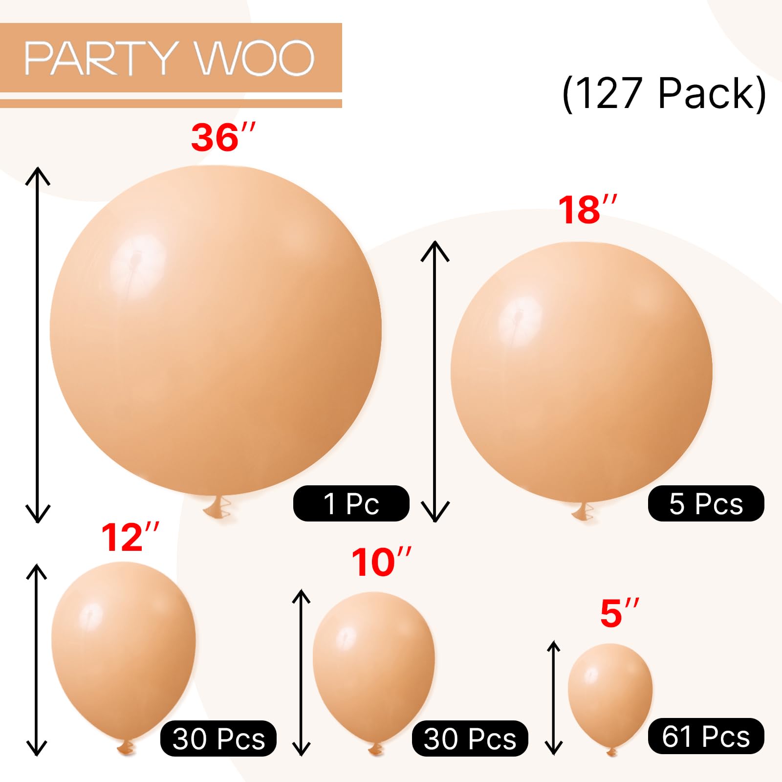 - Package includes: 36 inch nude balloons (1pcs), 18 inch nude balloons (5pcs), 12 inch nude balloons (30pcs), 10 inch nude balloons (30pcs), 5 inch nude balloons (61pcs). Pay attentions the 5 inch balloons could NOT float when inflated with HELIUM.