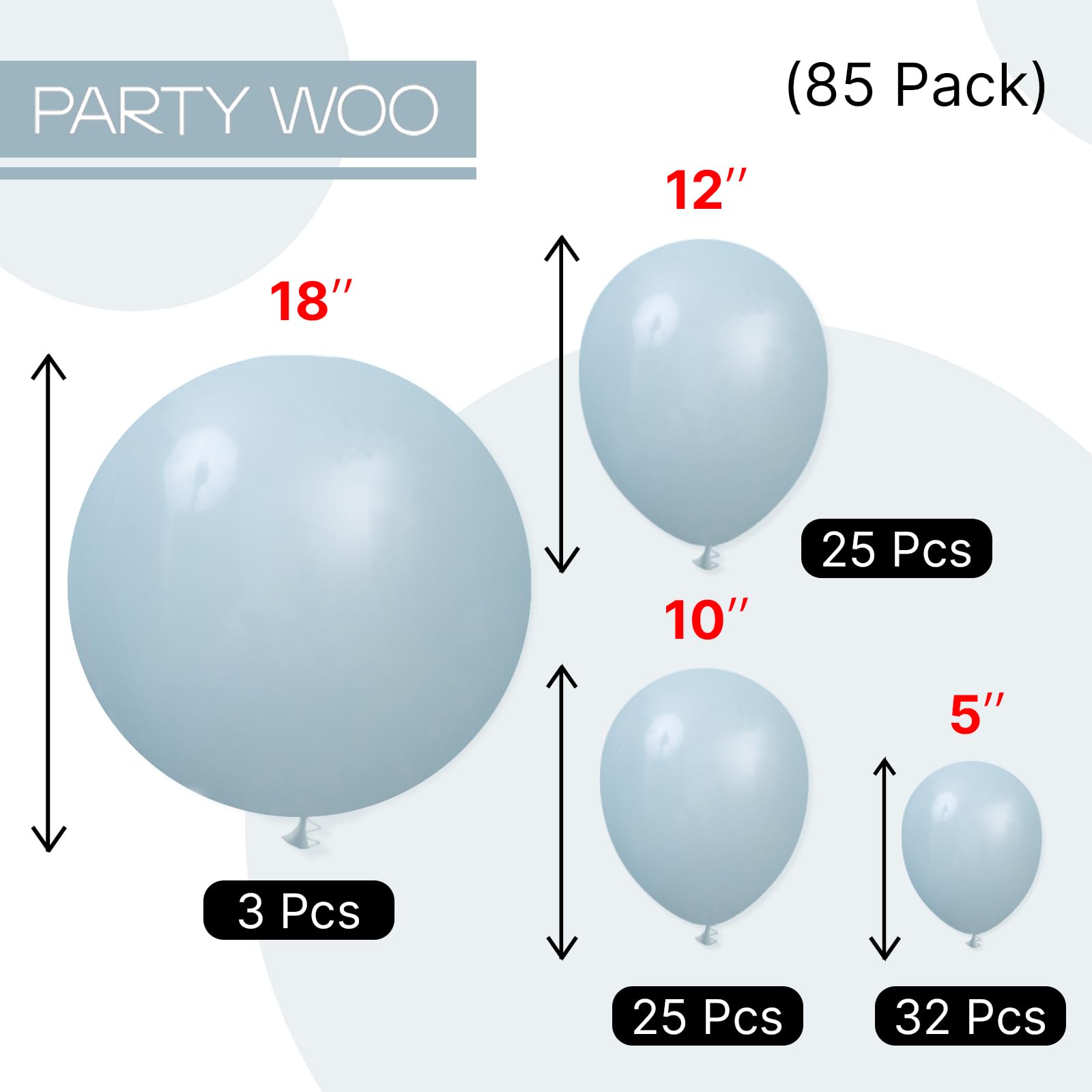 - Package includes: 18 inch dusty blue balloons (3pcs), 12 inch dusty blue balloons (25pcs), 10 inch dusty blue balloons (25pcs), 5 inch dusty blue balloons (32cs), pay attentions that the 5 inch balloons could NOT float when inflated with HELIUM.