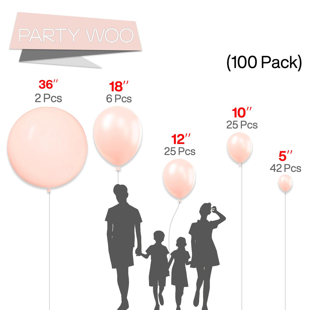 - 100 PCS PALE PINK BALLOONS DIFFERENT SIZES: Package includes 36 inch balloon (1 pc), 18 inch balloons (3 pcs), 12 inch balloons (20 pcs), 10 inch balloons (20 pcs), 5 inch balloons (56 pcs)