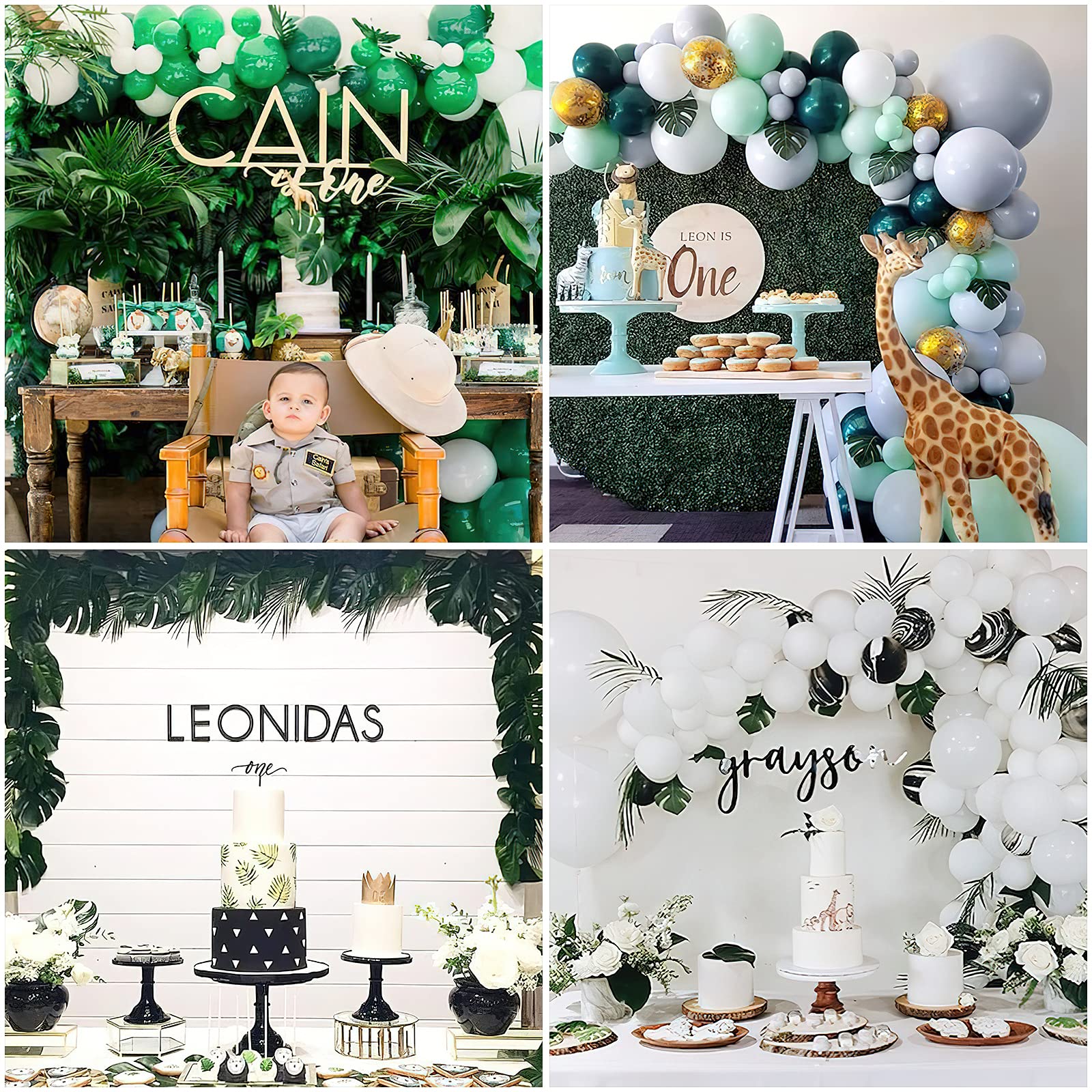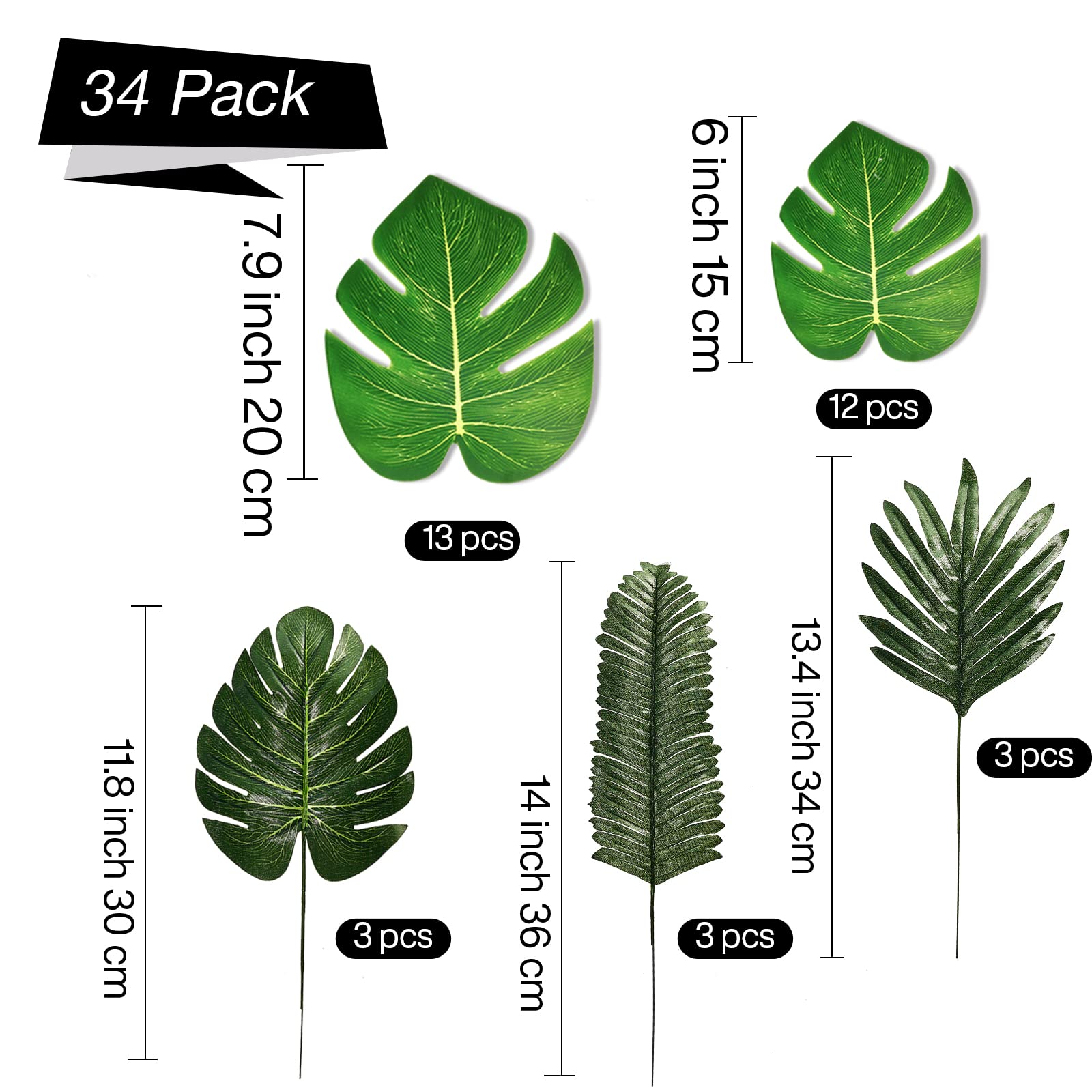 • 34 pcs Artificial Leaves: The package includes 35 cm / 14 inch large artificial leaves (6 pcs), 30 cm / 12 inch medium fake leaves (3 pcs), 20 cm / 8 inch Tropical Leaves (13 pcs) and 15 cm / 6 inch small monstera leaf (12 pcs). You could use it for hawaiian birthday party decorations, summer party decorations, luau party supplies, tropical party decorations