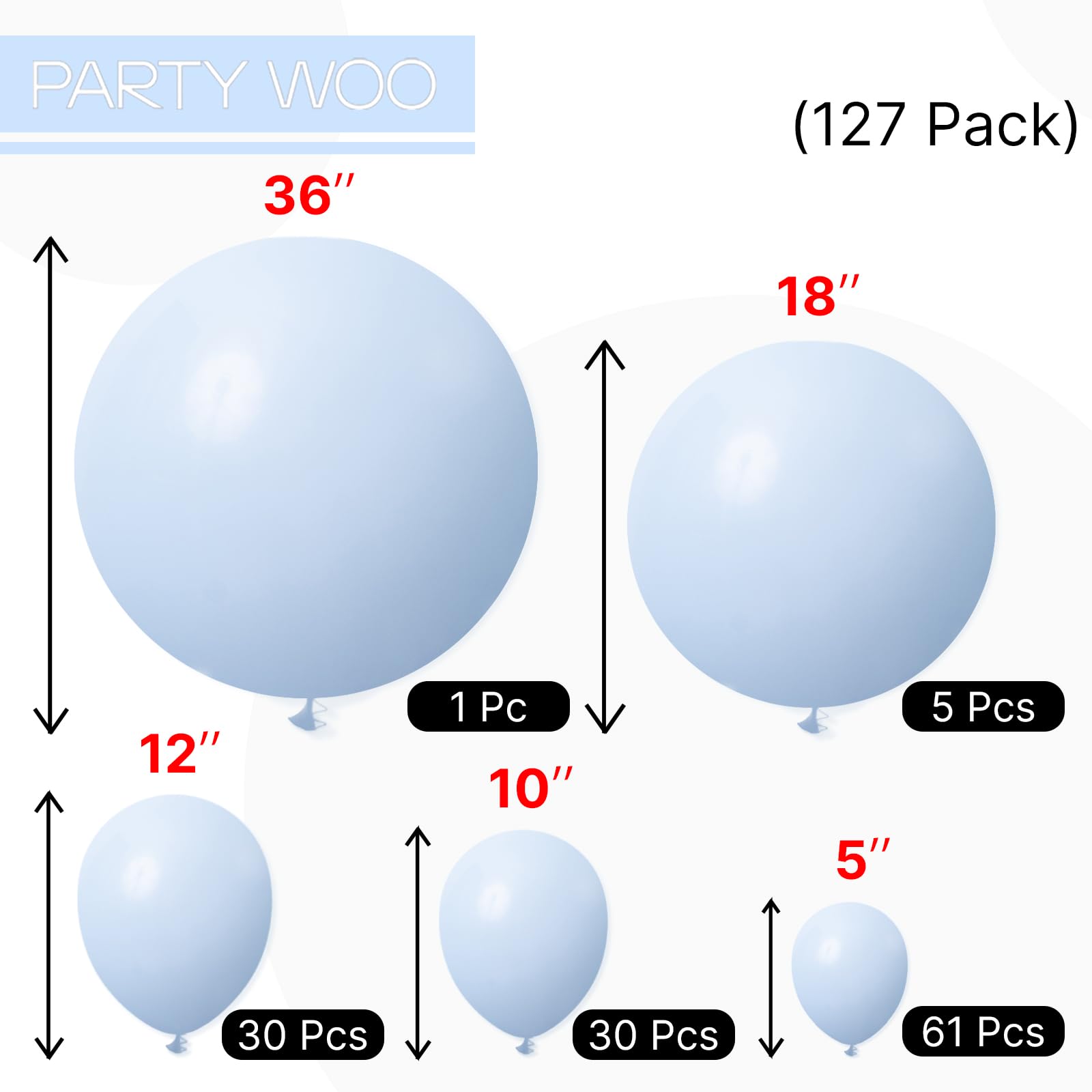 - Package includes: 36 inch light blue balloons (1pcs), 18 inch balloons (5pcs), 12 inch balloons (30pcs), 10 inch balloons (30pcs), 5 inch light blue balloons (60pcs), pay attentions that the 5 inch balloons could NOT float when inflated with HELIUM.