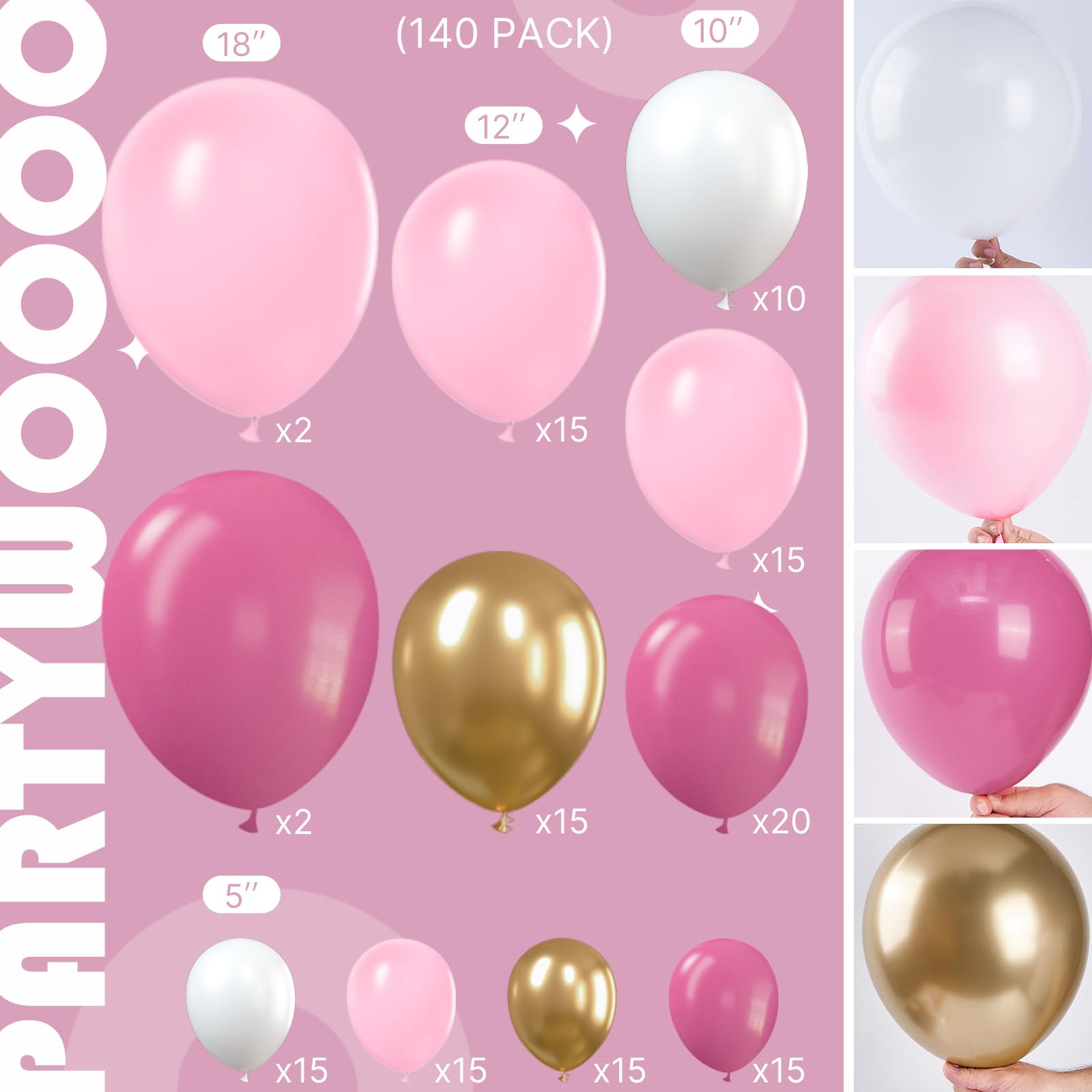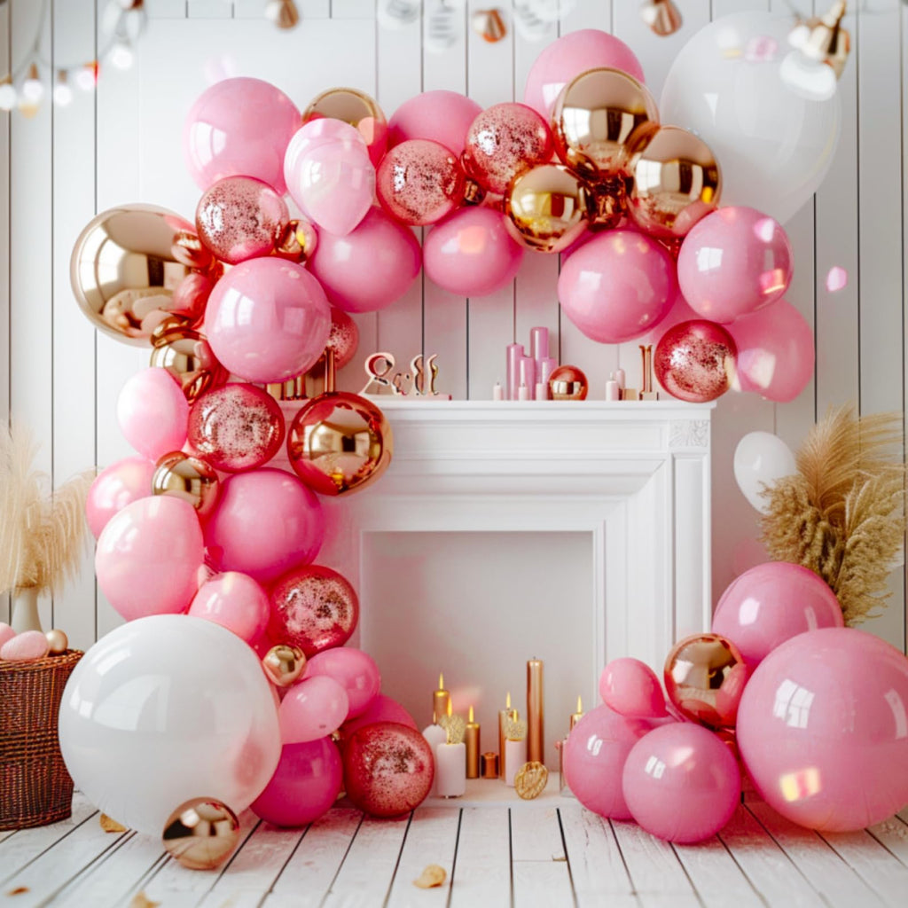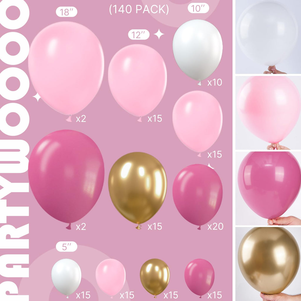- 140 PCS PINK AND CHROME GOLD BALLOONS DIFFERENT SIZES: Package includes 18 inch balloons 4 pcs, 12 inch balloons 30 pcs, 10 inch balloons 45 pcs, 5 inch small balloons 60 pcs, balloon decorating strip kit 1 set