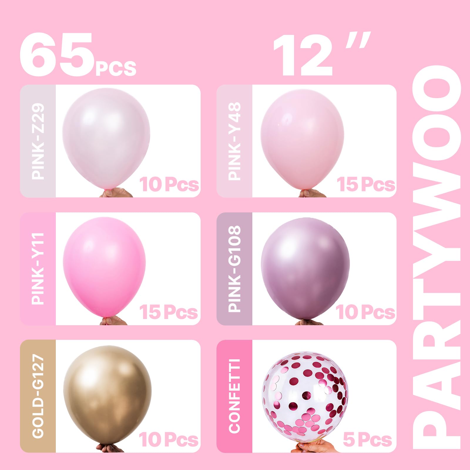 - Package includes: 12 inch matte pink balloons (30 pcs), pearl light pink balloons (10 pcs), metallic pink balloons (10 pcs), metallic gold balloons (10pcs), pink confetti balloons (5 pcs). These pink balloons can widely used in graduation, baby shower.