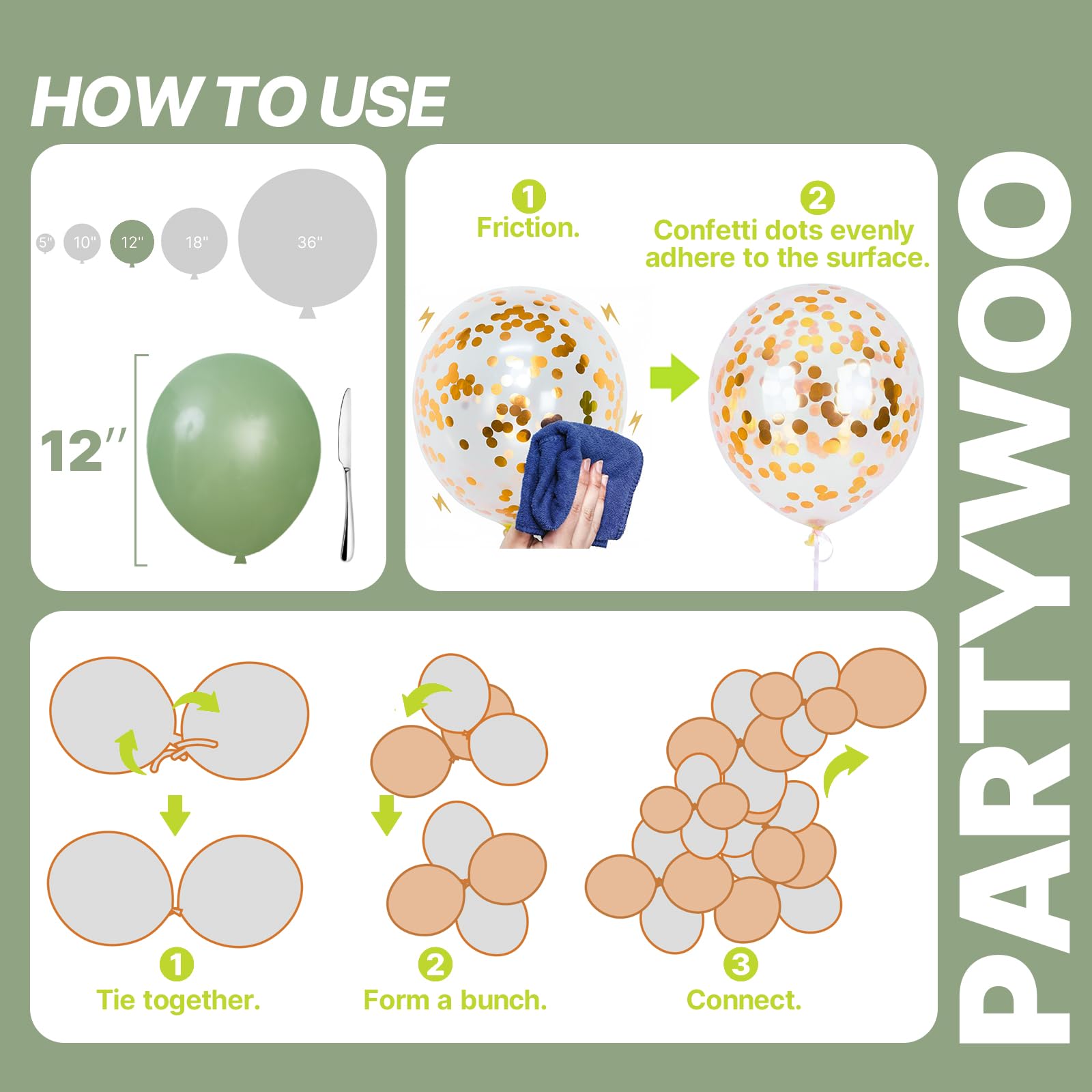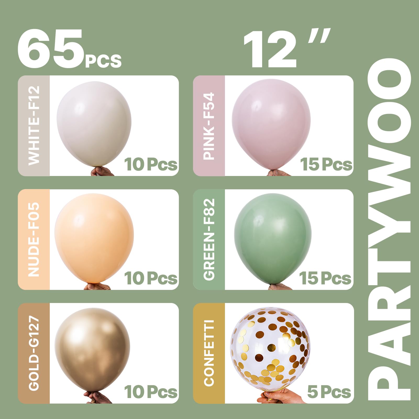 - Package includes: 12 inch sage green balloons (15 pcs), nude balloons(10pcs), dusty pink balloons(15pcs), white sand balloons(10pcs), metallic gold balloons (10 pcs), gold confetti balloons (5 pcs). These pink and green balloons can widely used in party.