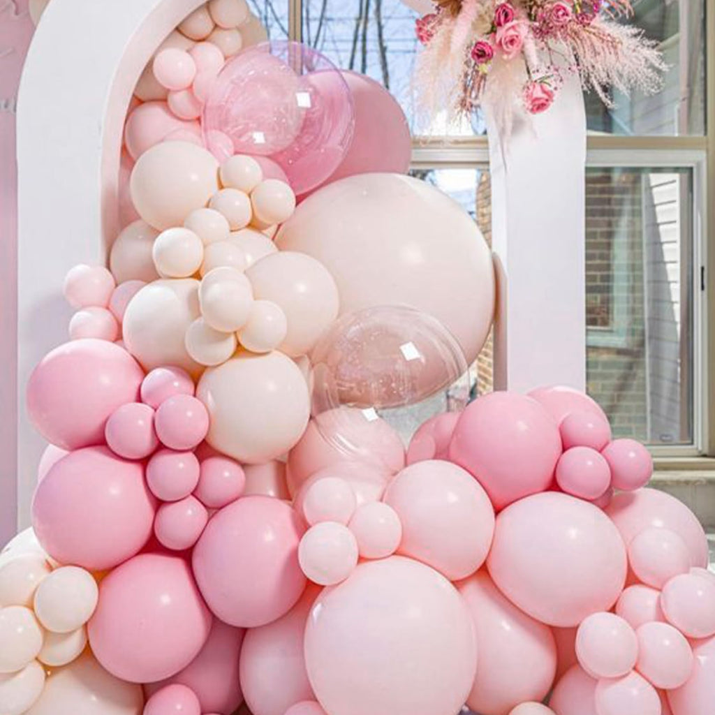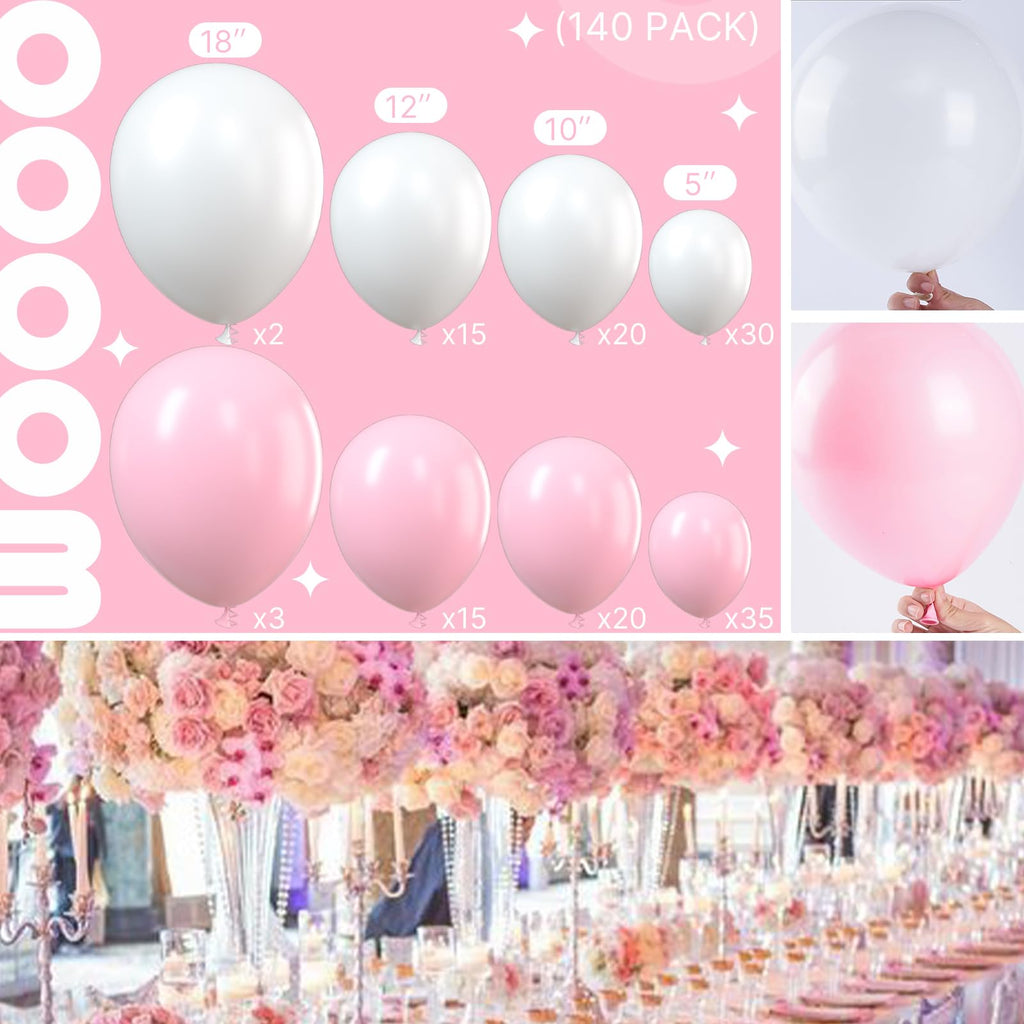 - 140 PCS PASTEL PINK AND WHITE BALLOONS DIFFERENT SIZES: Package includes 18 inch balloons 5 pcs, 12 inch balloons 30 pcs, 10 inch balloons 40 pcs, 5 inch small balloons 65 pcs, balloon decorating strip included