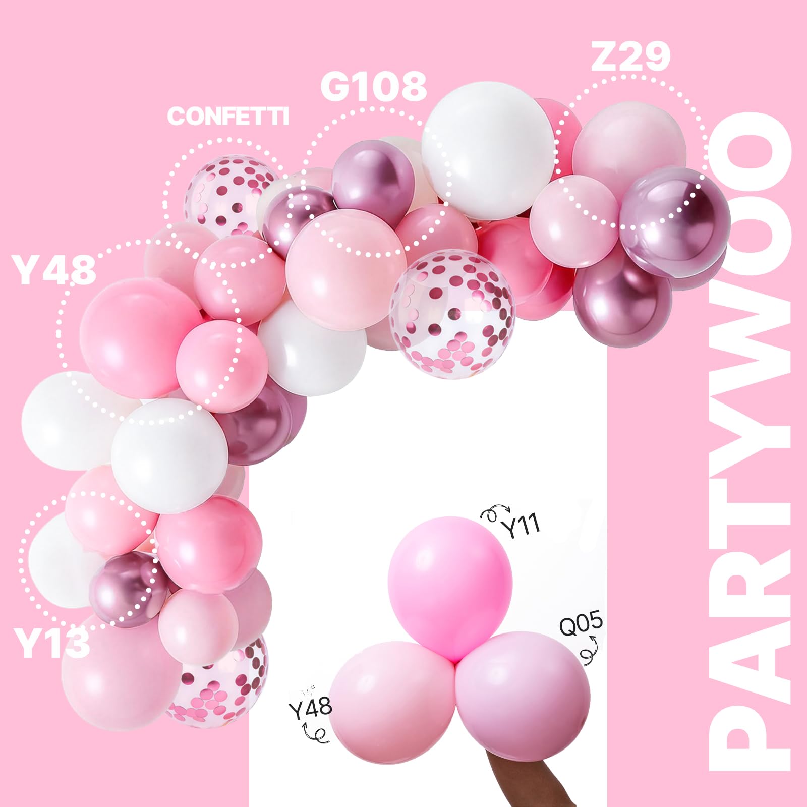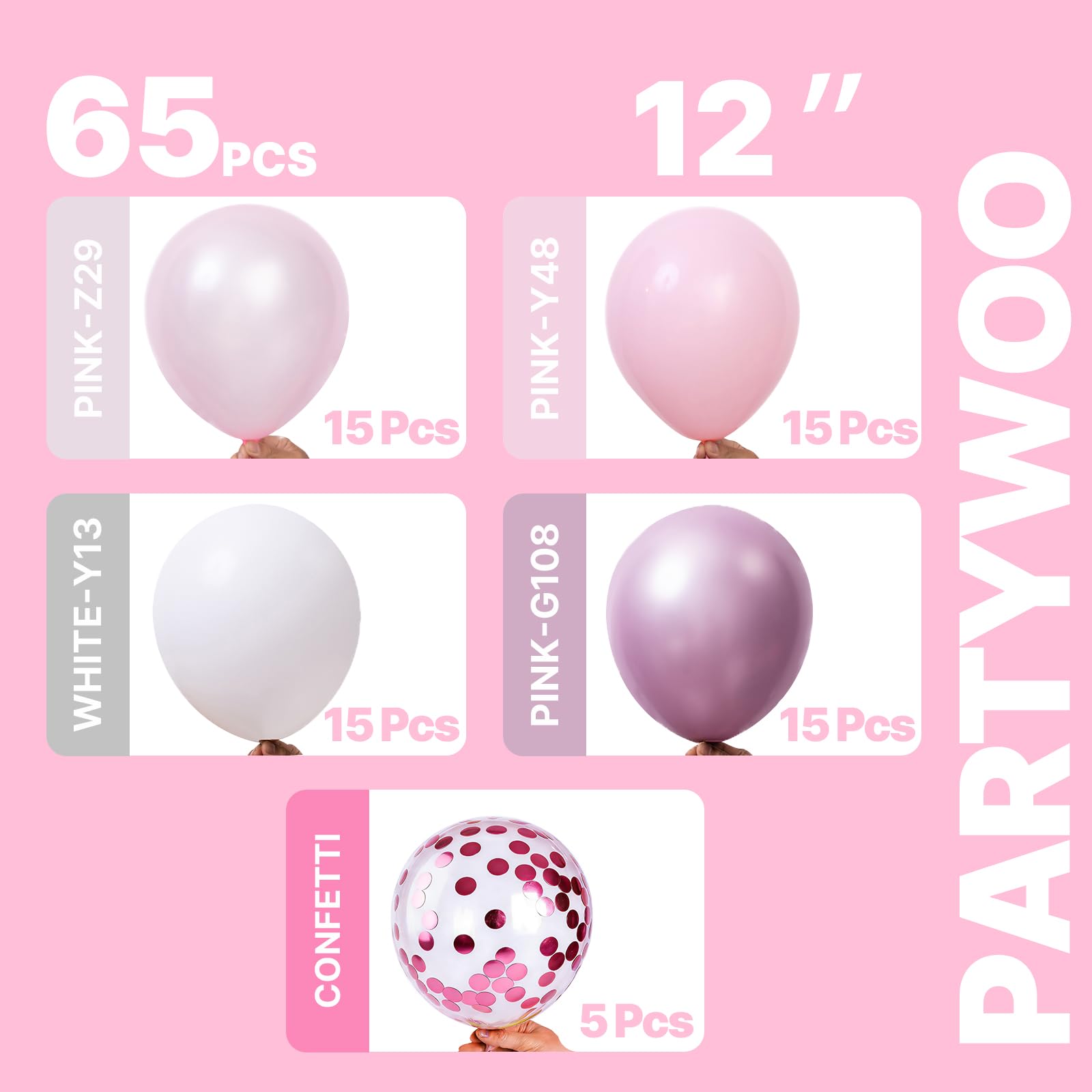 - Package includes: 12 inch white balloons (15 pcs), pearl pink balloons (15 pcs), metallic pink balloons (15 pcs) light pink balloons (15pcs) pink confetti balloons (5 pcs). These pink and white balloons can widely used in graduation, baby shower.