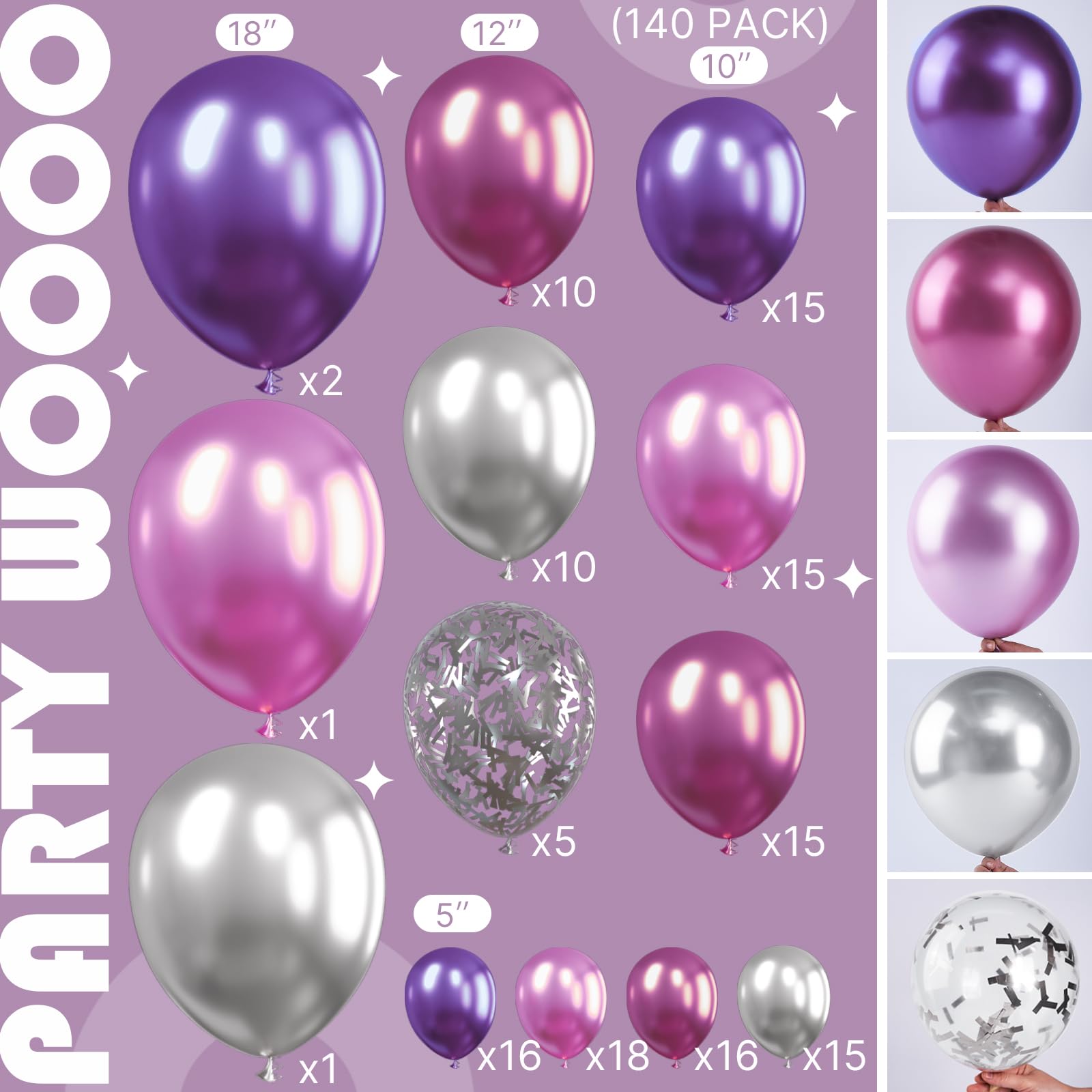 - 140 pcs PURPLE SAHDES BALLOONS DIFFERENT SIZES: 18 inch balloons 4 pcs (metallic pink x1, metallic silver x1, metallic purple x2), 12 inch balloons 25 pcs (silver confetti x5, metallic silver x10, metallic magenta x10), 10 inch balloons 45 pcs (metallic pink x15, metallic purple x15, metallic magenta x15), 5 inch small balloons 65 pcs (metallic silver x15, metallic purple x16, metallic magenta x16, metallic pink x18), garland kit and manual included