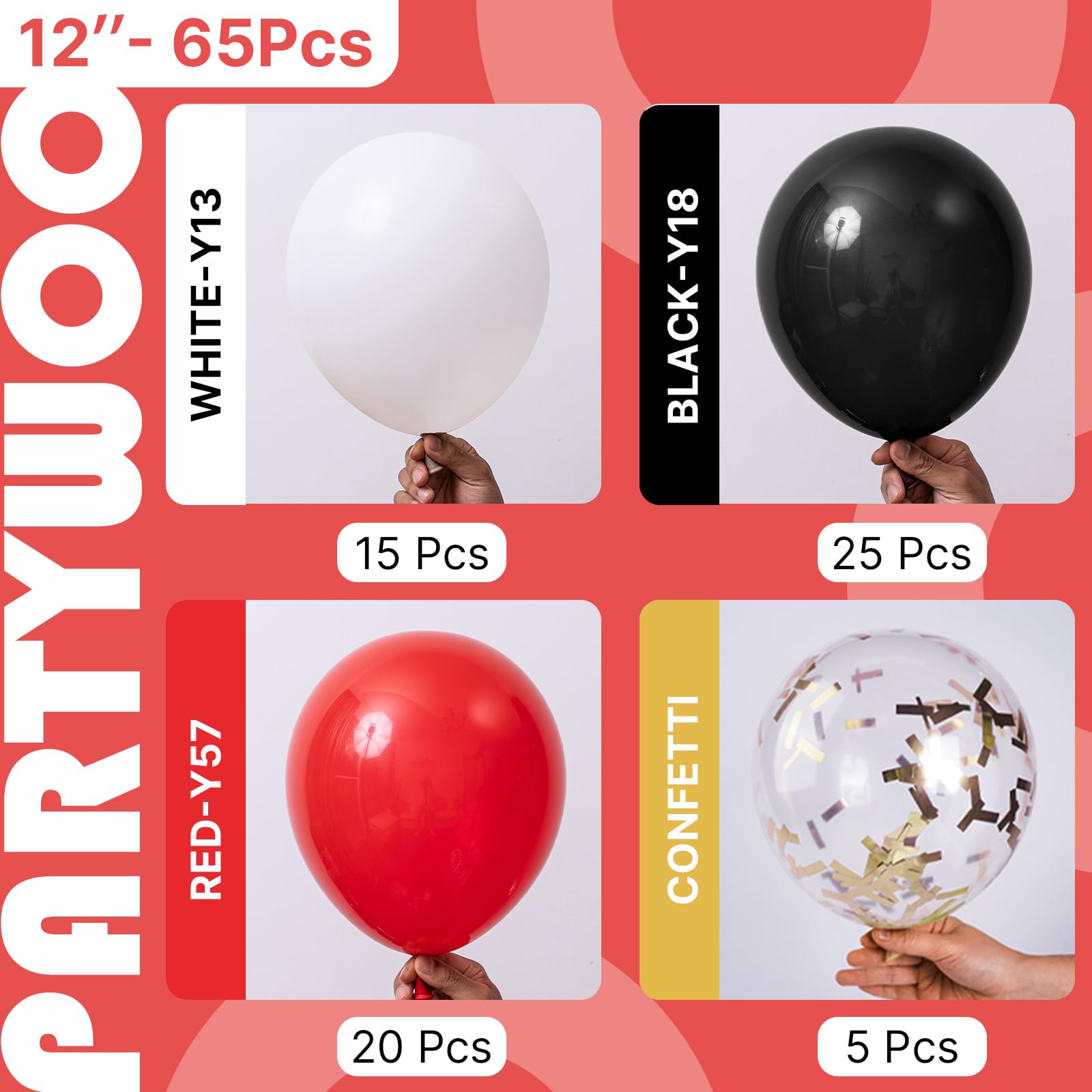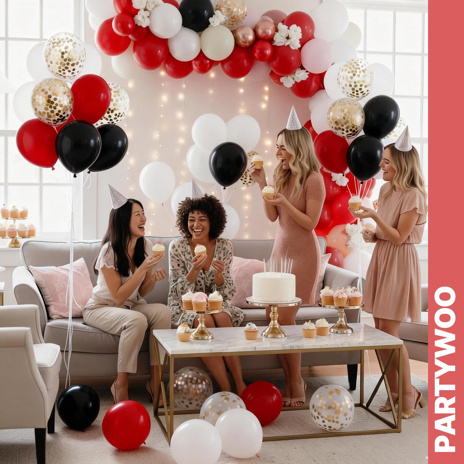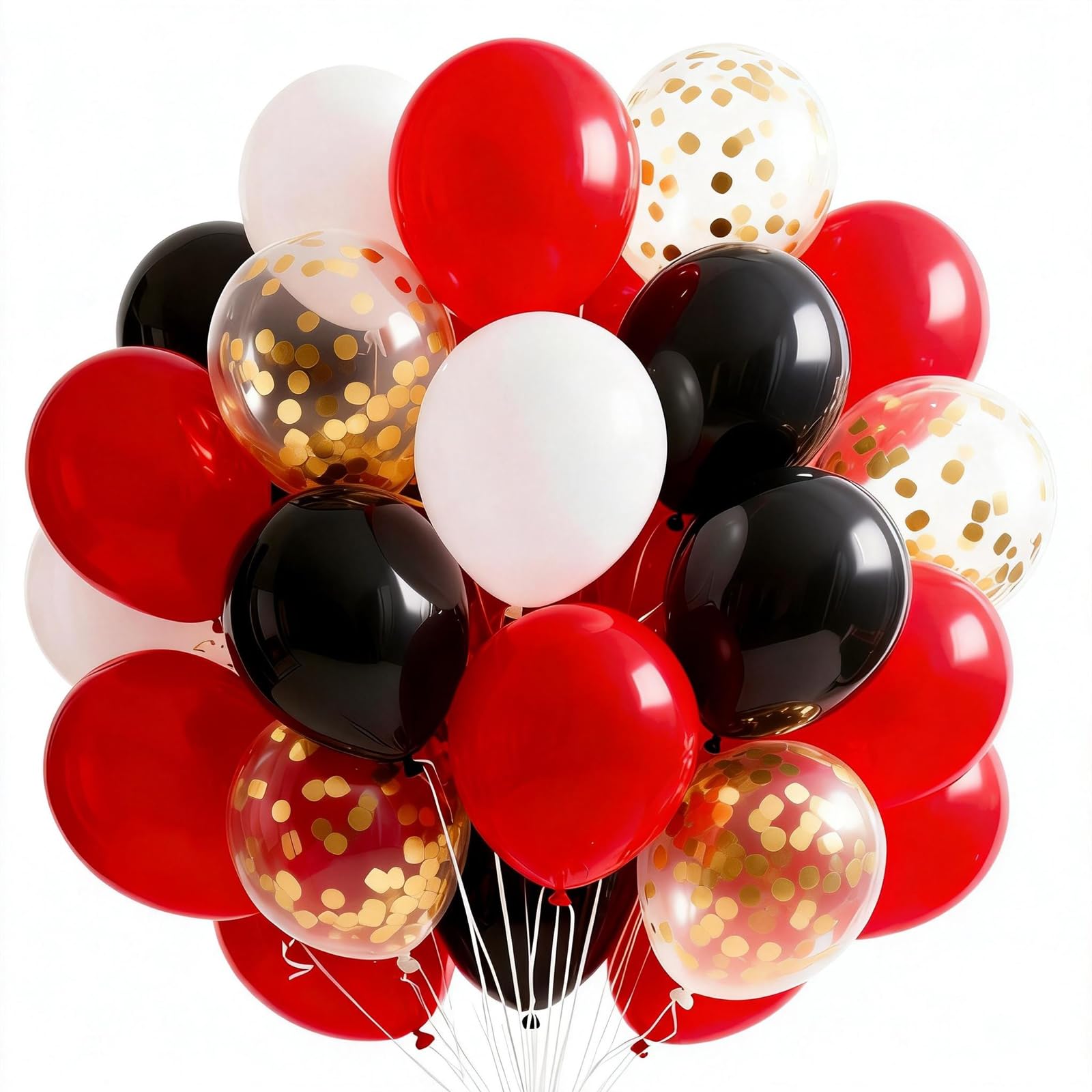 - Package includes: 12 inch black balloons (25 pcs), white balloons (15 pcs), matte red balloons (20 pcs), gold confetti balloons (5 pcs). These red and black balloons can widely used in graduation, baby shower decorations, and make your party bright.