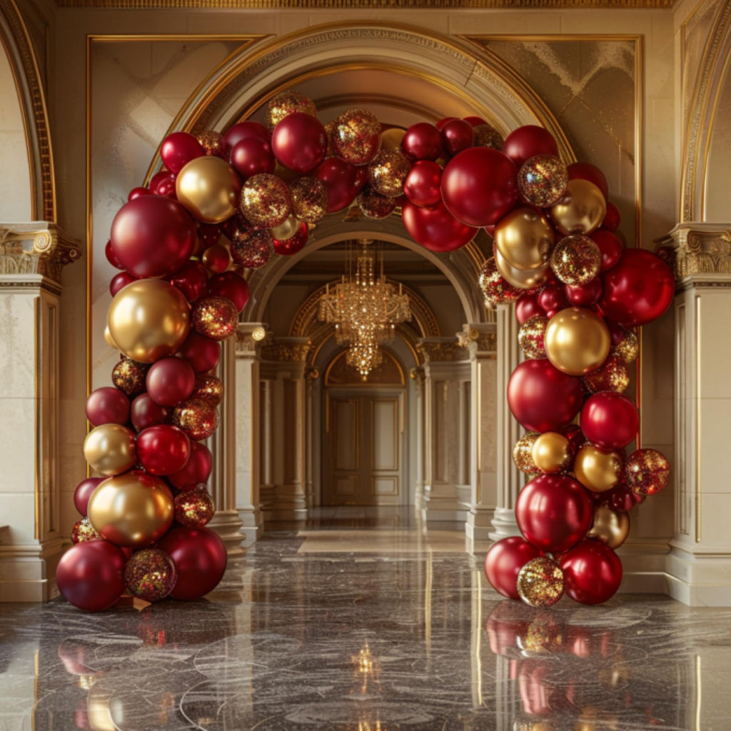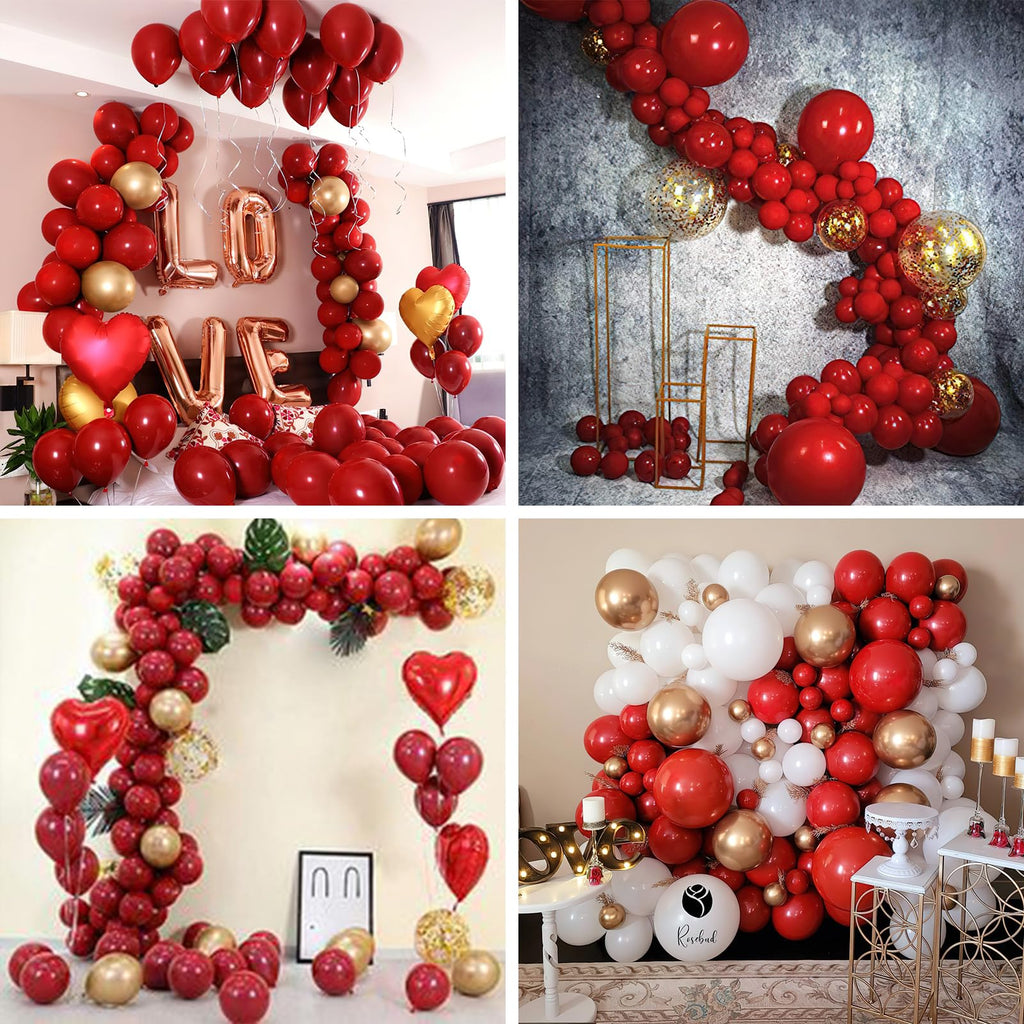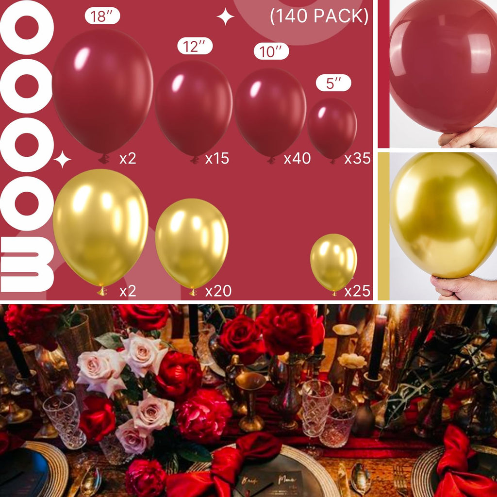 - 140 PCS RED AND GOLD BALLOONS DIFFERENT SIZES: Package includes 18 inch balloons 4 pcs, 12 inch balloons 35 pcs, 10 inch balloons 40 pcs, 5 inch small balloons 60 pcs, balloon decorating strip kit 1 set
