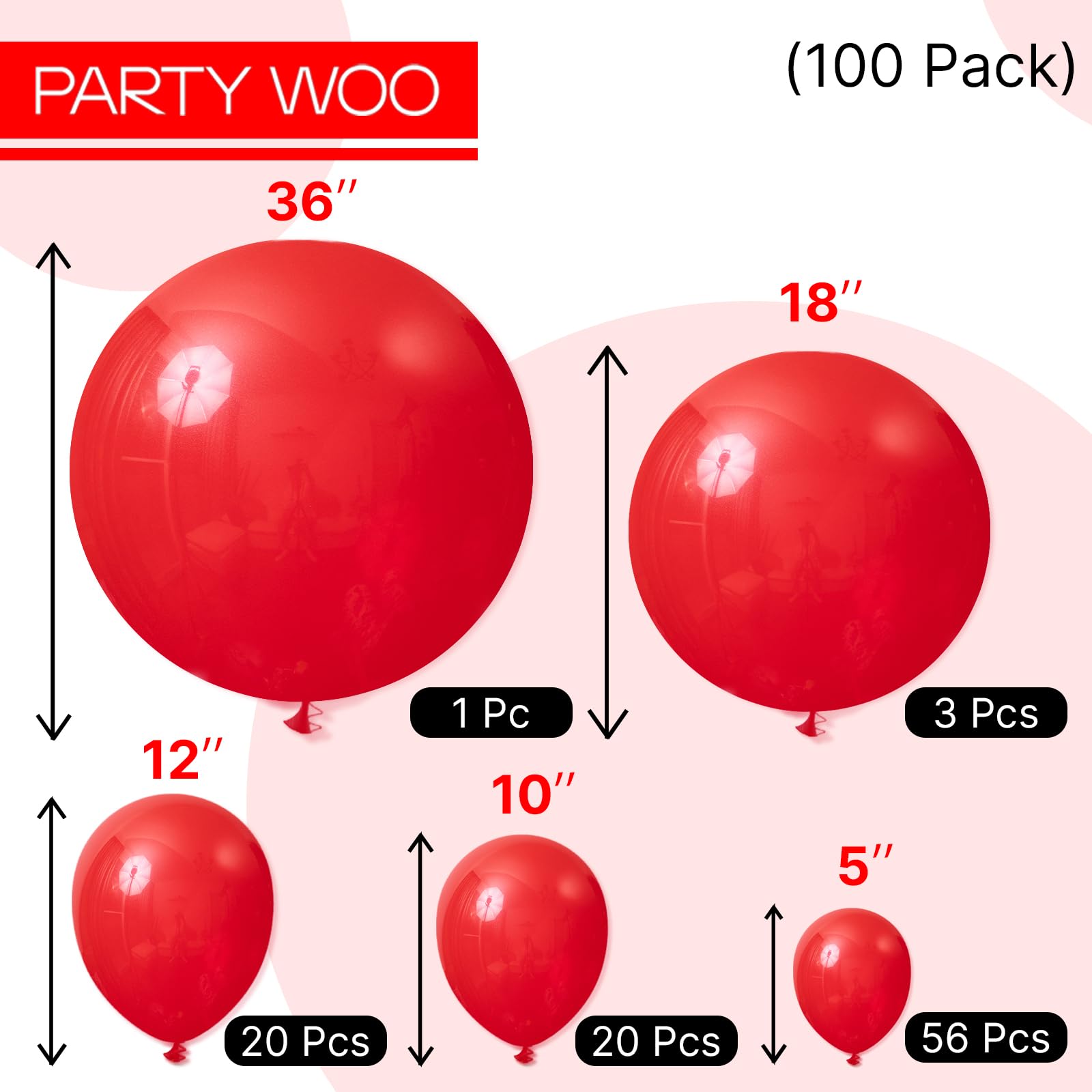 - 100 PCS RED BALLOONS DIFFERENT SIZES: Package includes 36 inch balloon (1 pc), 18 inch balloons (3 pcs), 12 inch balloons (20 pcs), 10 inch balloons (20 pcs), 5 inch balloons (56 pcs)