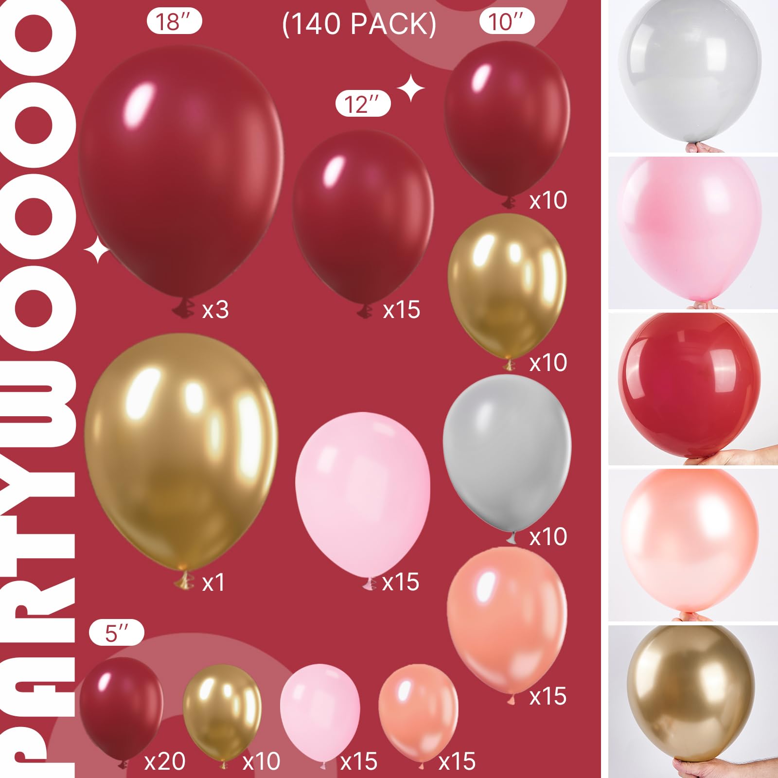 - 140 PCS RED PINK GOLD BALLOONS DIFFERENT SIZES: Package includes 18 inch balloons 4 pcs, 12 inch balloons 30 pcs, 10 inch balloons 45 pcs, 5 inch small balloons 60 pcs, balloon decorating strip kit 1 set