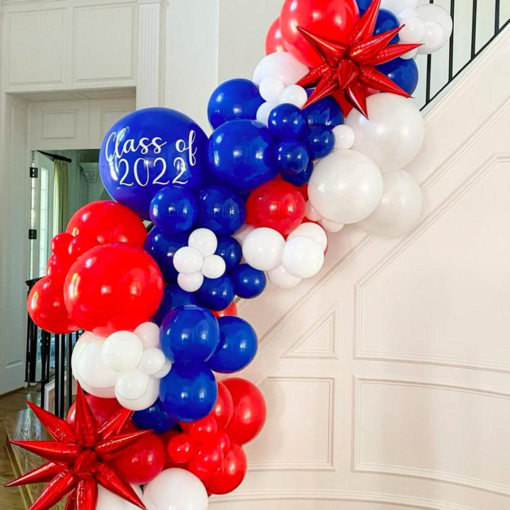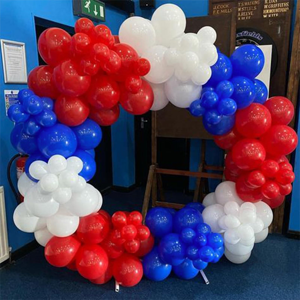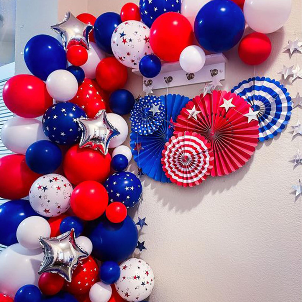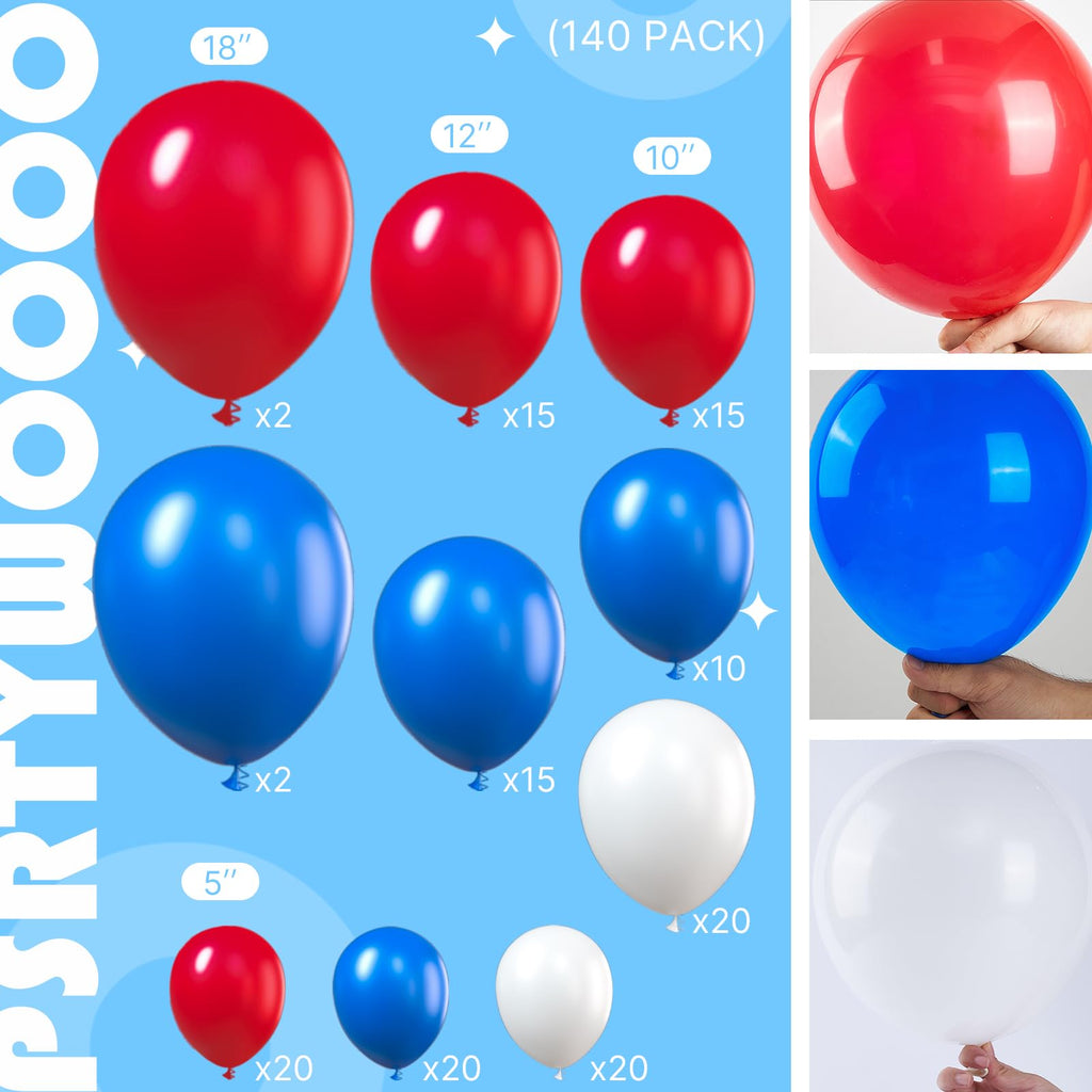 - 140 PCS RED WHITE BLUE BALLOONS DIFFERENT SIZES: Package includes 18 inch balloons 4 pcs, 12 inch balloons 30 pcs, 10 inch balloons 45 pcs, 5 inch small balloons 60 pcs, balloon decorating strip kit 1 set