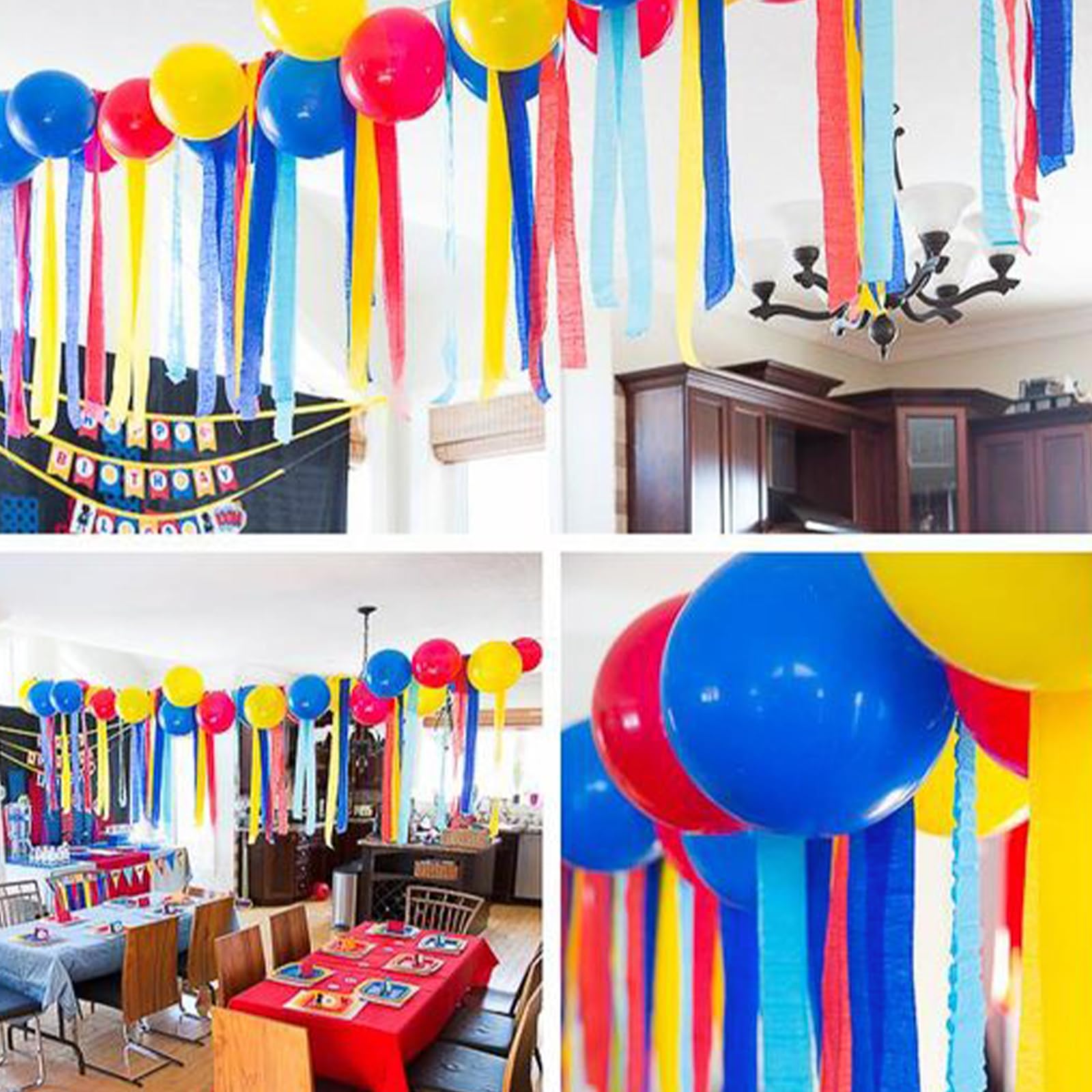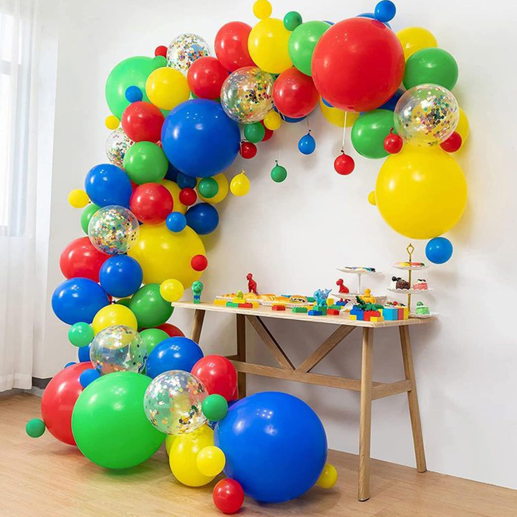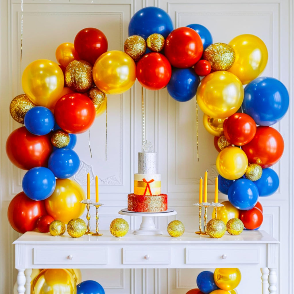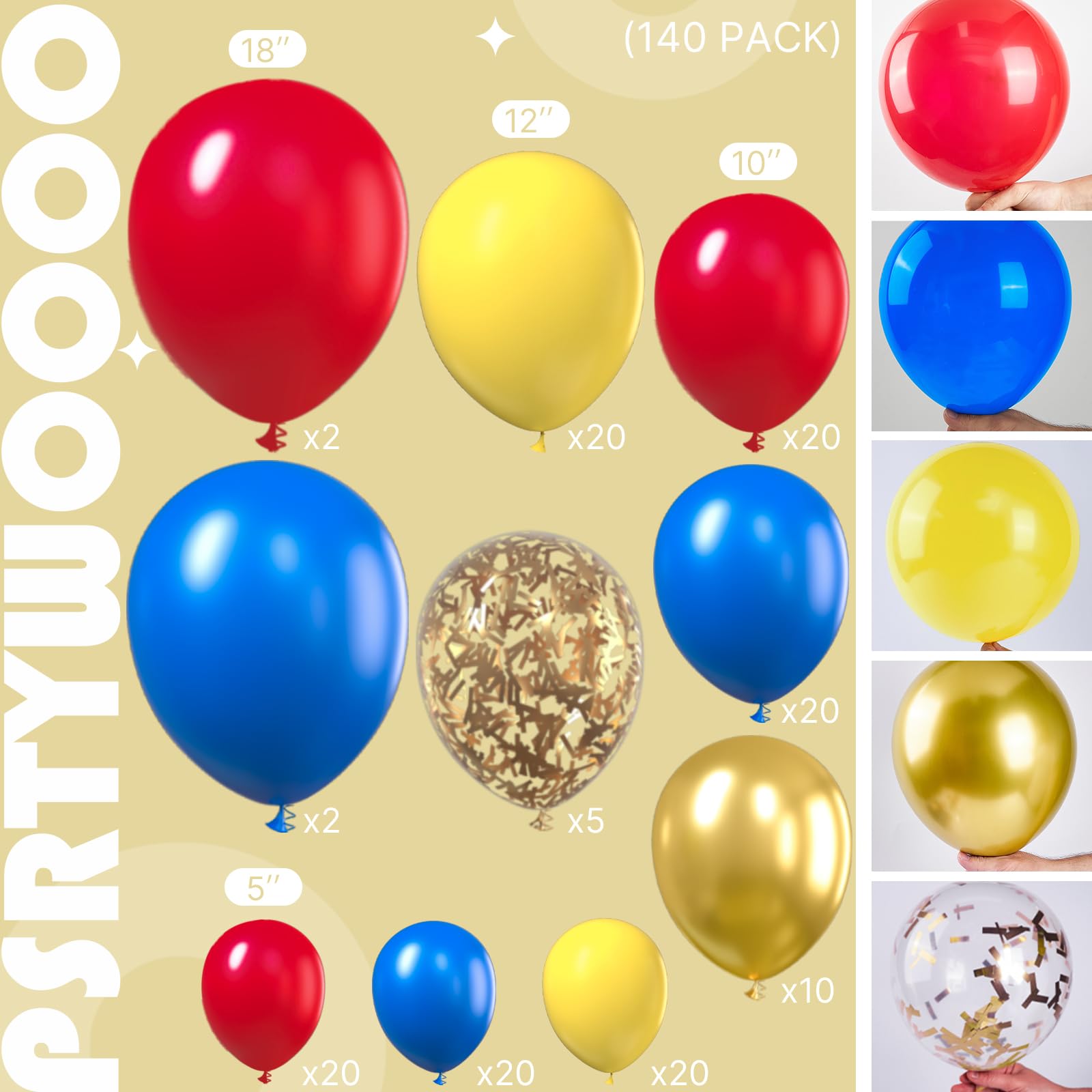 - 140 PCS RED BLUE YELLOW BALLOONS DIFFERENT SIZES: Package includes 18 inch balloons 4 pcs, 12 inch balloons 25 pcs, 10 inch balloons 50 pcs, 5 inch small balloons 60 pcs, balloon decorating strip kit 1 set